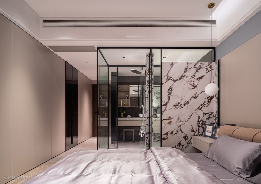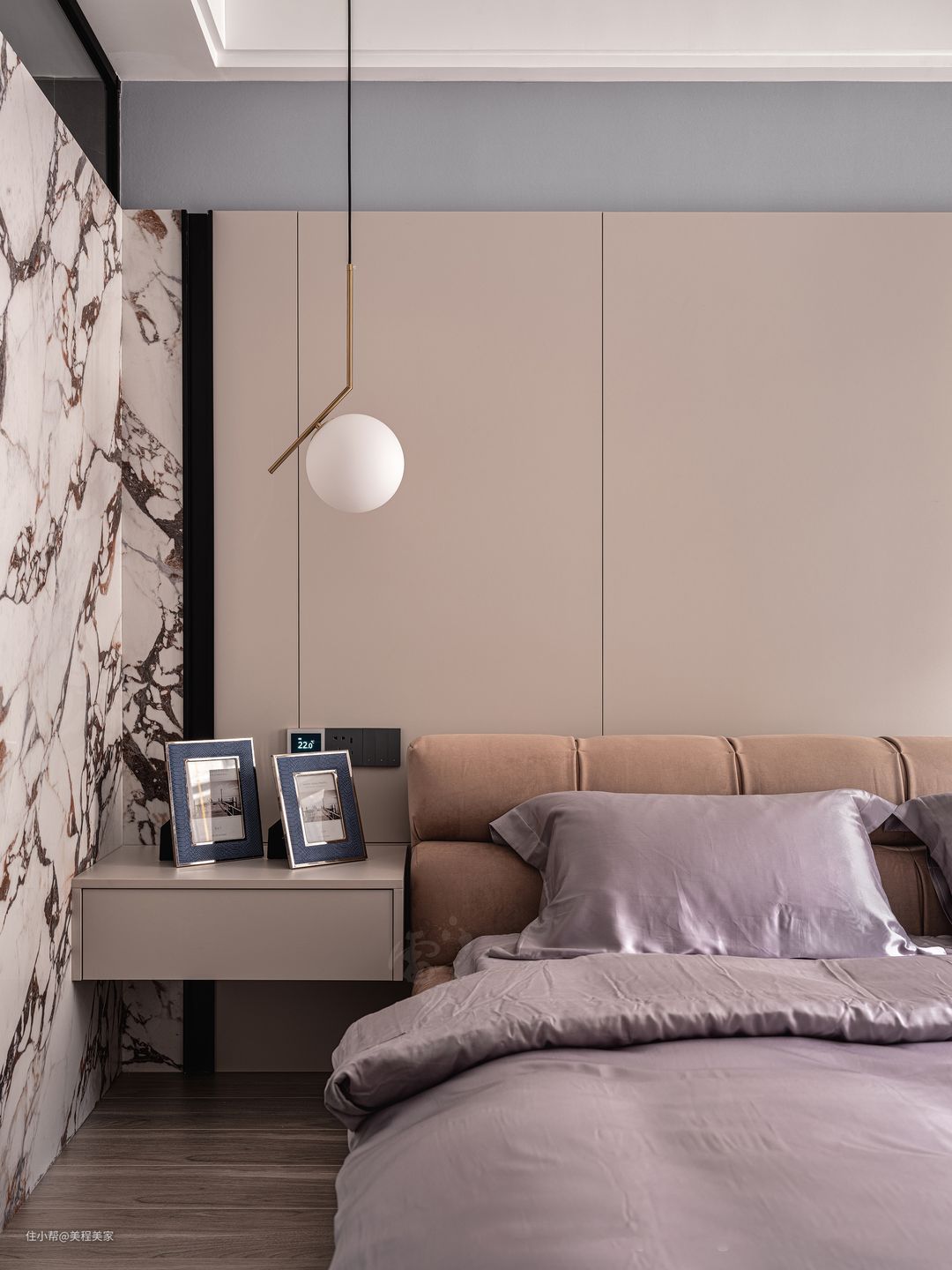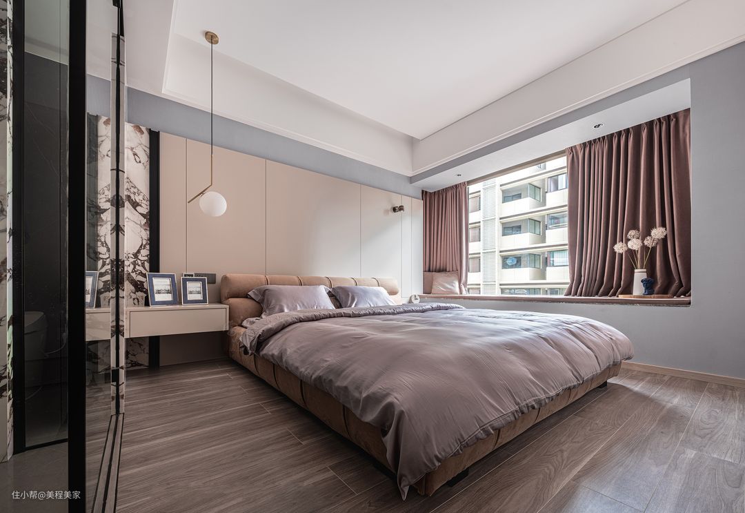 卧室中,每一个细节都精心打造,共同营造出一种既简约又不失温馨的居住氛围。 卧室的主色调以灰色和米色为主,这两种颜色的和谐搭配,既显得低调内敛,又不失高雅与温馨。灰白色的墙面仿佛一块柔和的画布,为整个空间奠定了宁静的基调。而米色的天花板则像是轻轻笼罩在头顶的云朵,增添了几分柔和与梦幻。 地板是木质的,与整体设计相得益彰,木质的纹理清晰可见,给人一种自然亲切的感觉。走在上面,脚步声轻盈而有节奏,仿佛是在与大自然进行一场亲密的对话。