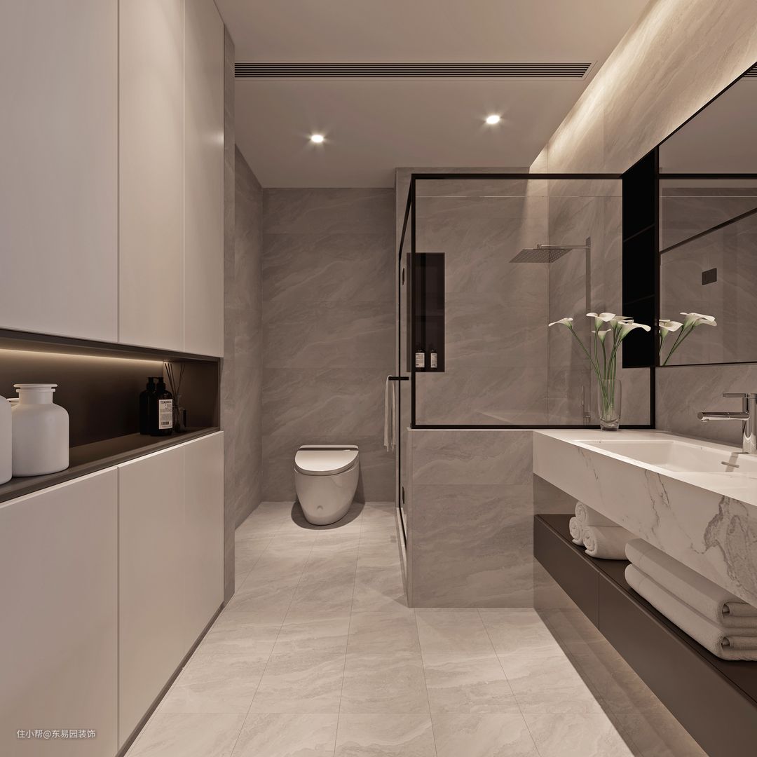 浴室采用灰色和白色为主色调,这种搭配既简洁又高雅,营造出一种清新、宁静的氛围。灰色的大理石纹理瓷砖不仅增加了空间的质感,还使整体设计更加现代且易于清洁。