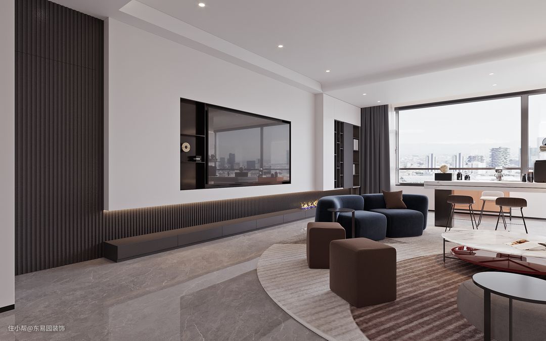 客厅---整体以黑白灰为基调,全屋采用无主灯设计,减去复杂的吊灯,房门套采用不锈钢门套+黑色踢脚线,增加空间的简洁,减少繁琐的线条,筒灯也是无边框筒灯,空调出回风口也都是无边框的线型风口。