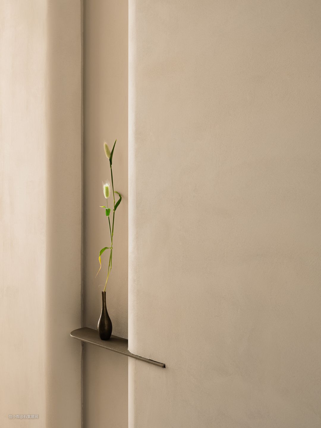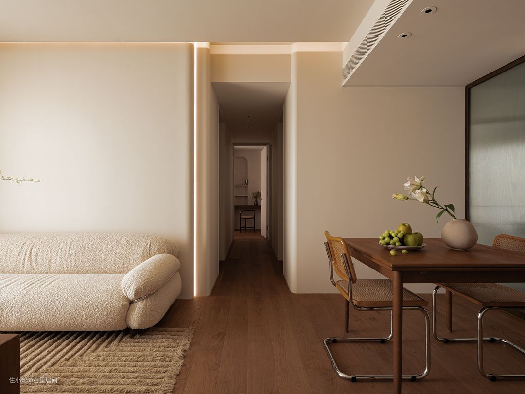 个性化的装修设计往往伴随着复杂的施工工艺,过道采用灵动的弧形与圆润的曲面元素在空间里错落叠加,通过色调,肌理与形状,描绘“裸”感美学空间,简明而意趣的调性,生动温柔。再以灯带作为场域的点亮与过渡
