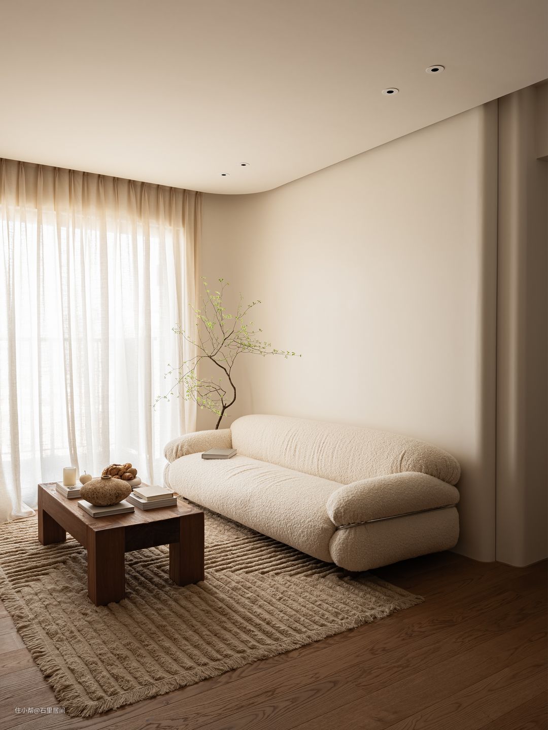 柔软舒适的米色布艺沙发贴墙而放,简单的造型勾勒出最自然惬意的休闲空间,骆色毛绒地点聚焦客厅中心,席地而坐更显惬意。墙面大面积留白,边角做圆弧形过渡,为空间平添几分灵动,既保留了白墙的大气耐看,又借由灯带内嵌的小巧思避免了白墙的单调性,在极简的基调中演变空间节奏