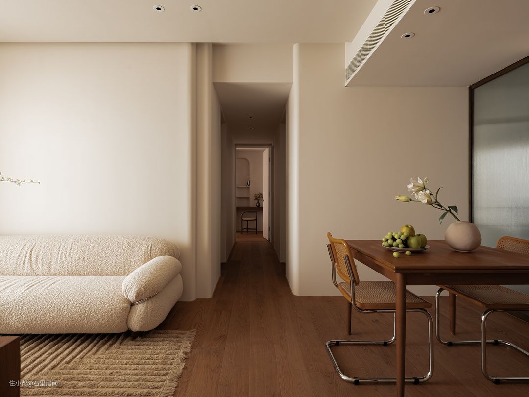 玄关区域以一方白色地砖拉开序幕,客厅暖色系原木地板自然过渡,深浅变幻,脏净分区,定制胡桃木通柜作为出入收储,无拉手设计干净利落,搭配筒灯点亮归家仪式感