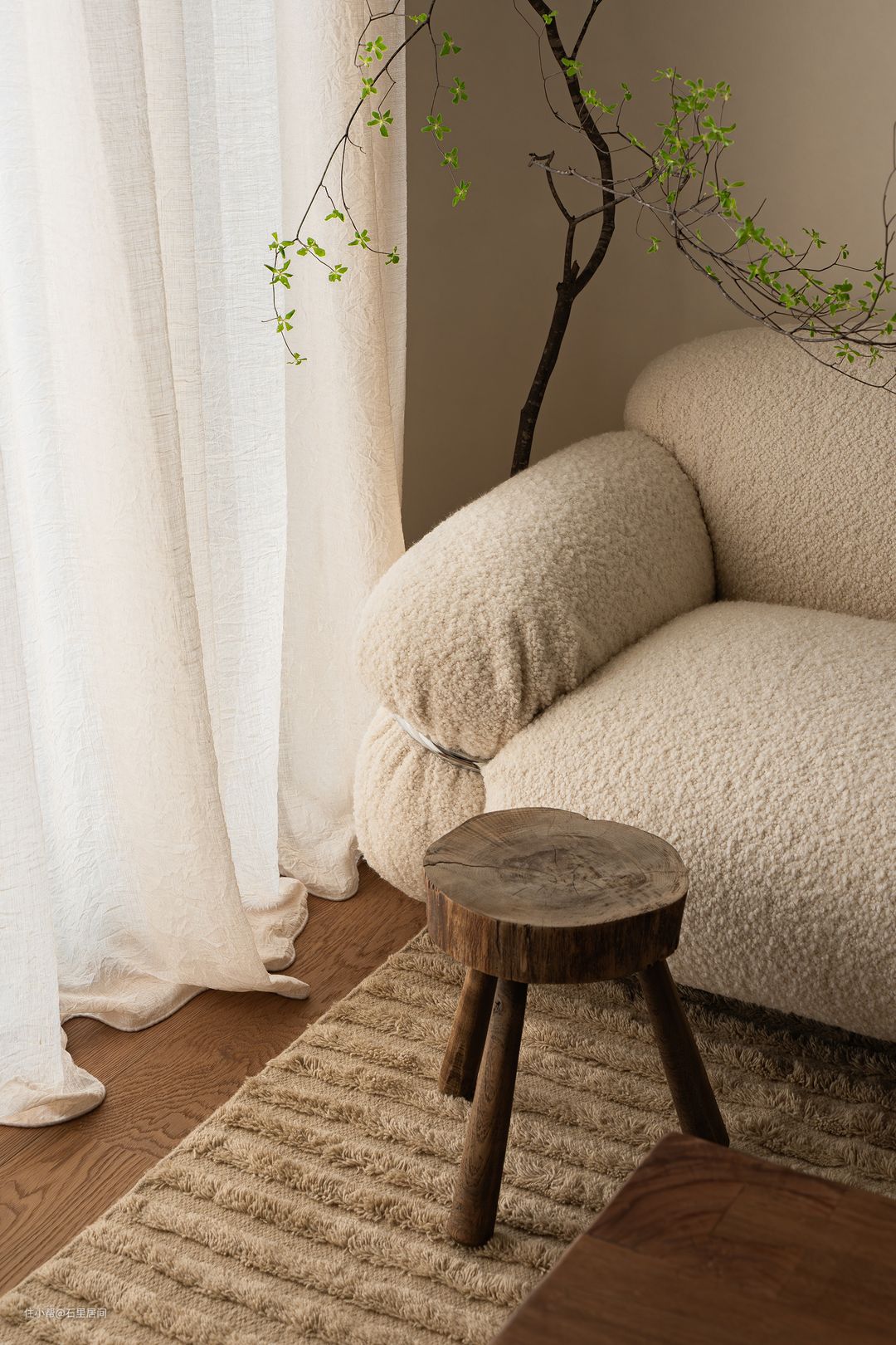 中古原木边际倚窗而置,中古风尽显,沙发一角绿枝摇曳,春意盎然,无形中构建一个自由而丰满的精神居所。室外光景透过奶白纱帘,美在角落,原木地板+白色背景墙、绿植等不同的材质纹理错层叠加,形成丰富饱满的休息场域