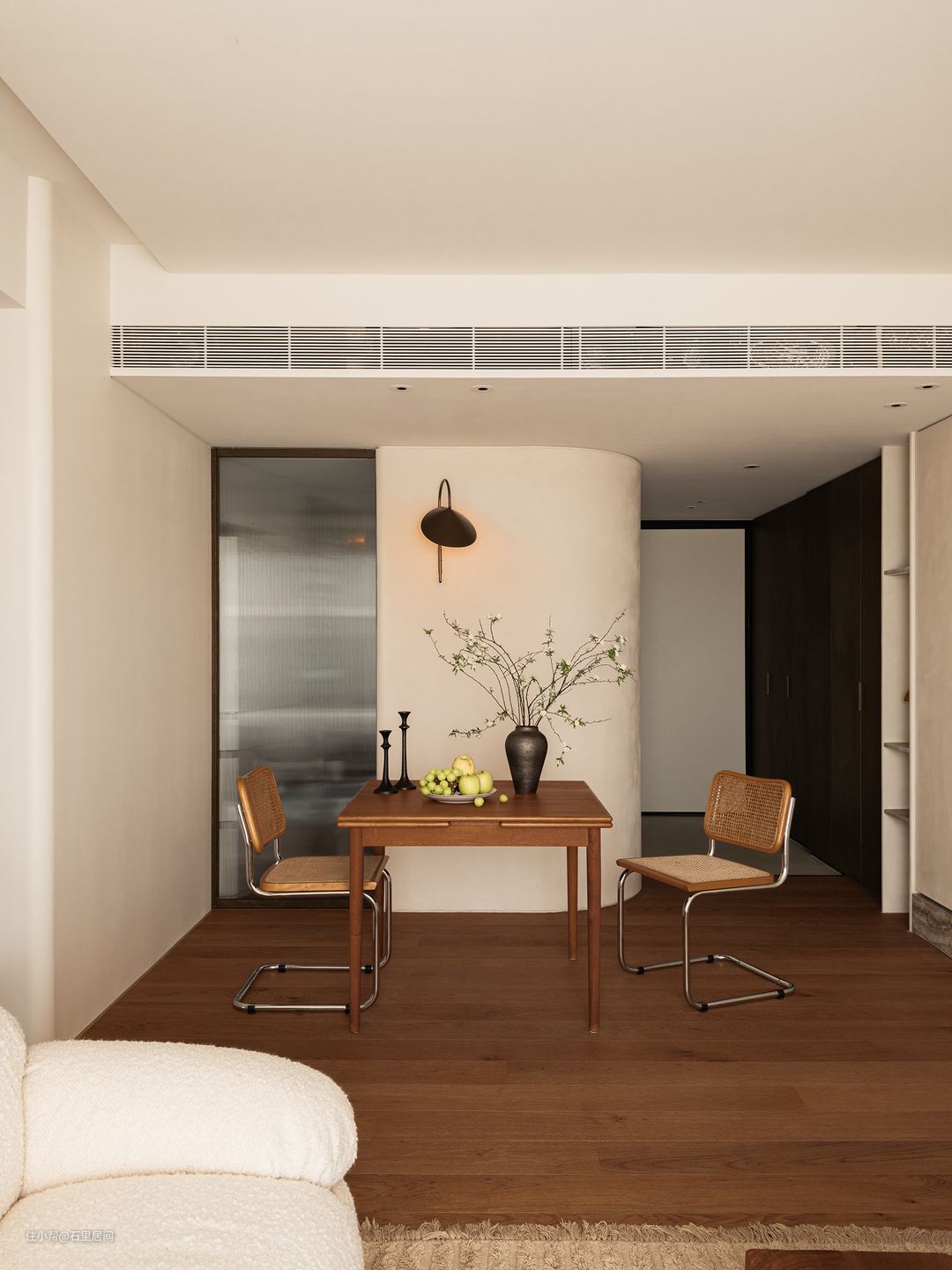 几何线条构成整体的设计元素,简单利落的轮廓,是带着惬意的舒适。奶油白乳胶漆上墙依靠曲面之间搭配了一盏花瓶,起到了一定的点缀作用