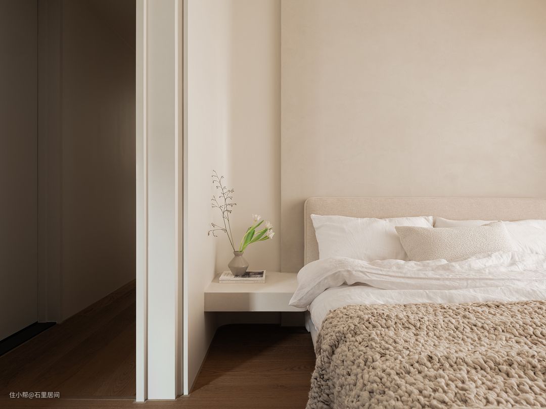 主卧的空间自带一个浴室的空间,功能完备,整体设计既符合屋主的生活习惯,又注重个人体验的私密感与舒适度,以达到身处其间悦享自在的设计目的。舒适的双人床靠着墙放置在偏中央的位置,空间布局上清晰流畅。右侧悬浮床头柜恰好与墙体相接,台面上搭配上花卉,展现生机勃勃的氛围 床尾的部分靠着墙面设计了整面通顶衣柜释放出巨大储物空间,奶白色调结合流畅的线条让空间的秩序感更上一个台阶,浅色系软装整体风格自然淳朴。一侧延申出悬浮式书桌,地面通铺原木地板,整体材质、色调统一,合二为一演绎平整美感