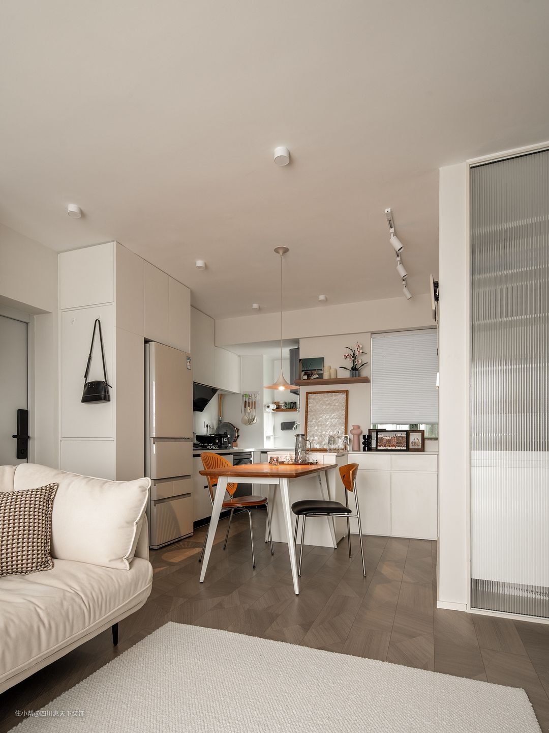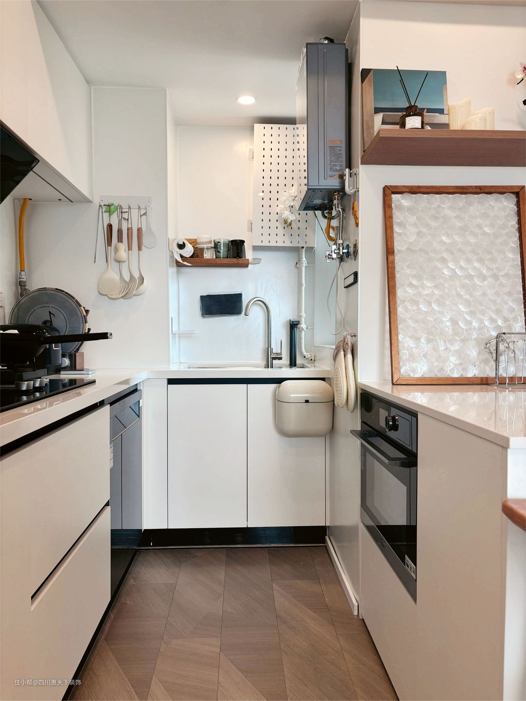 厨房墙体拆除做开放式,L型料理台连接吧台形成U型操作空间,电器放置于柜内节省空间,方便操作和食材的拿取。根据业主的身高和操作习惯,岛台高度90cm和料理台柜体高度 85cm 暖白色柜体,搭配樱桃木家具和棕灰色木地板的下沉,整体空间层次分明。操作台上方的墙面铺贴珐琅板,搭配磁吸收纳架和自带磁吸功能的厨房用品,可移动的属性更方便日常的使用和收纳的摆放。