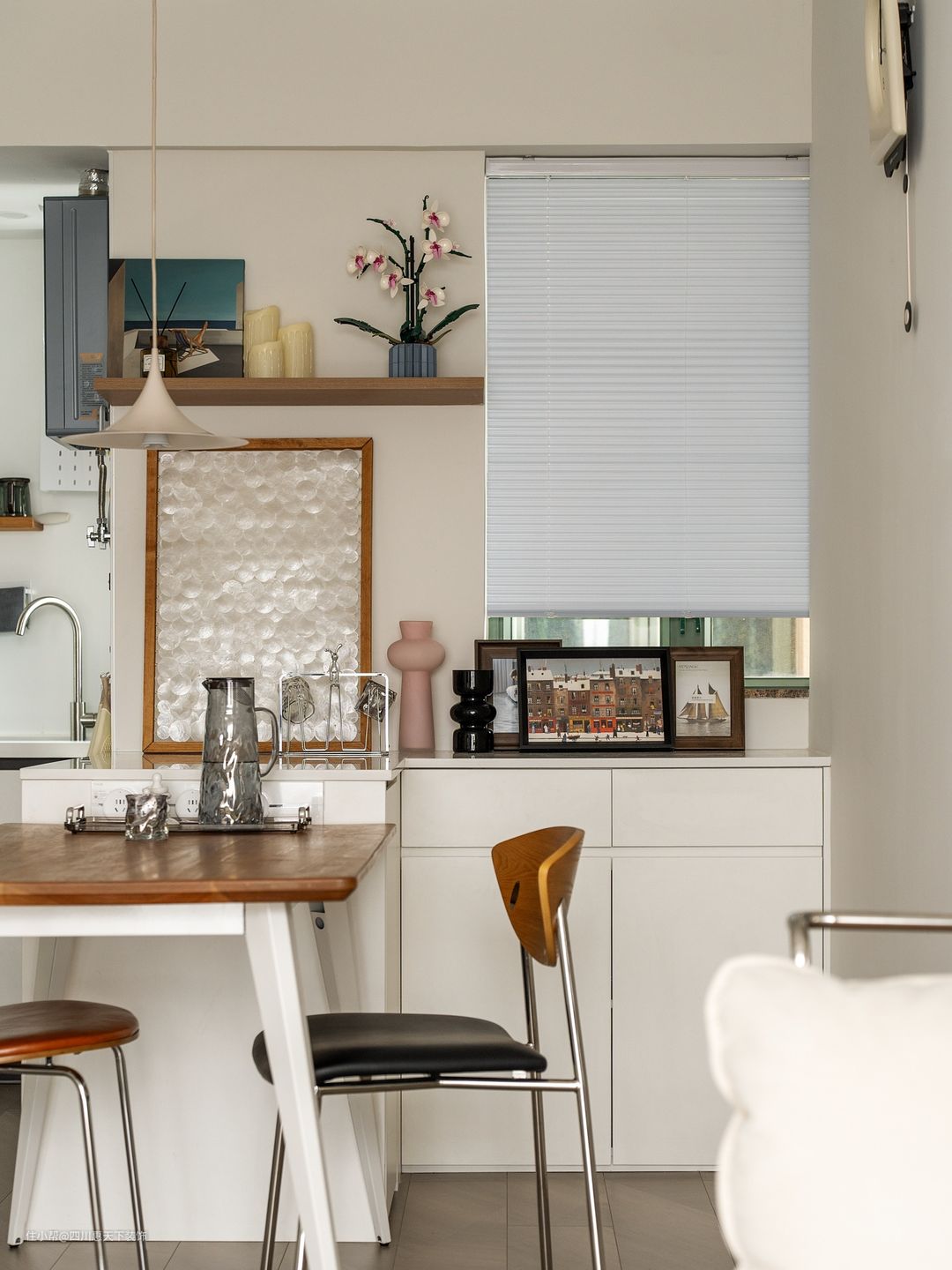餐桌连接吧台,吧台丰富了餐厅的使用,与餐边柜连接做L型操作台,餐桌高度 75cm ,利用餐桌与吧台的高度差,预留了轨道插座的位置,方便电器的使用。