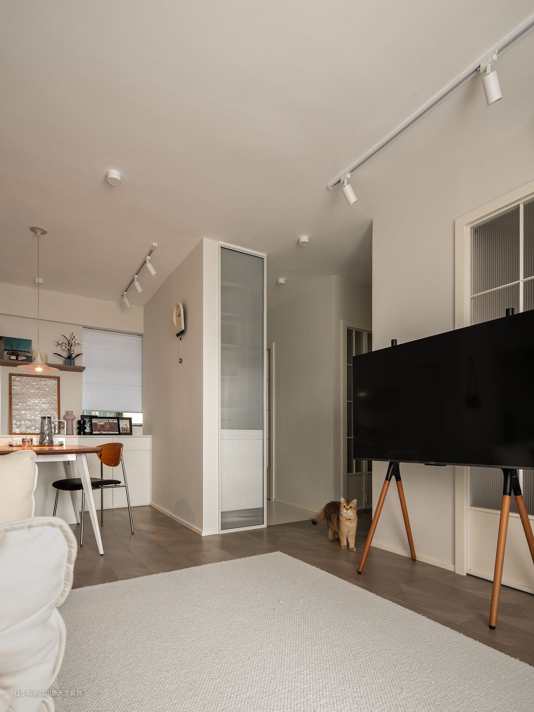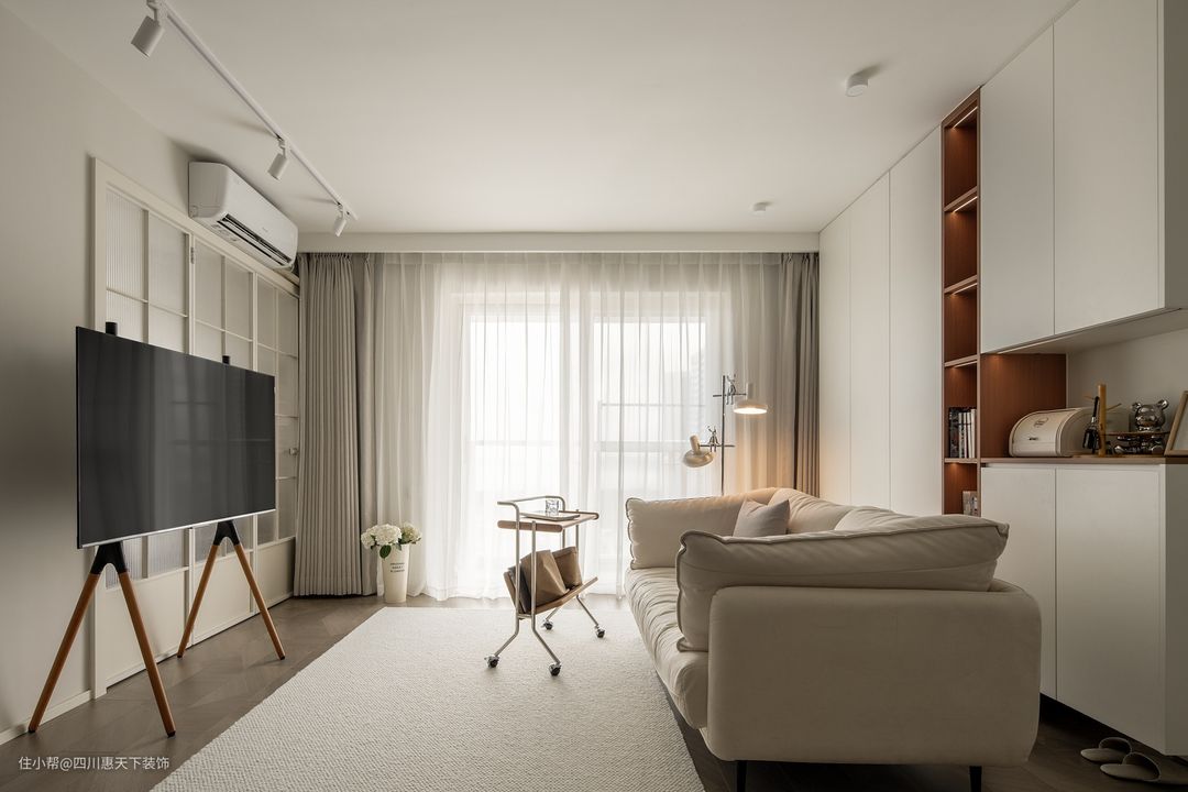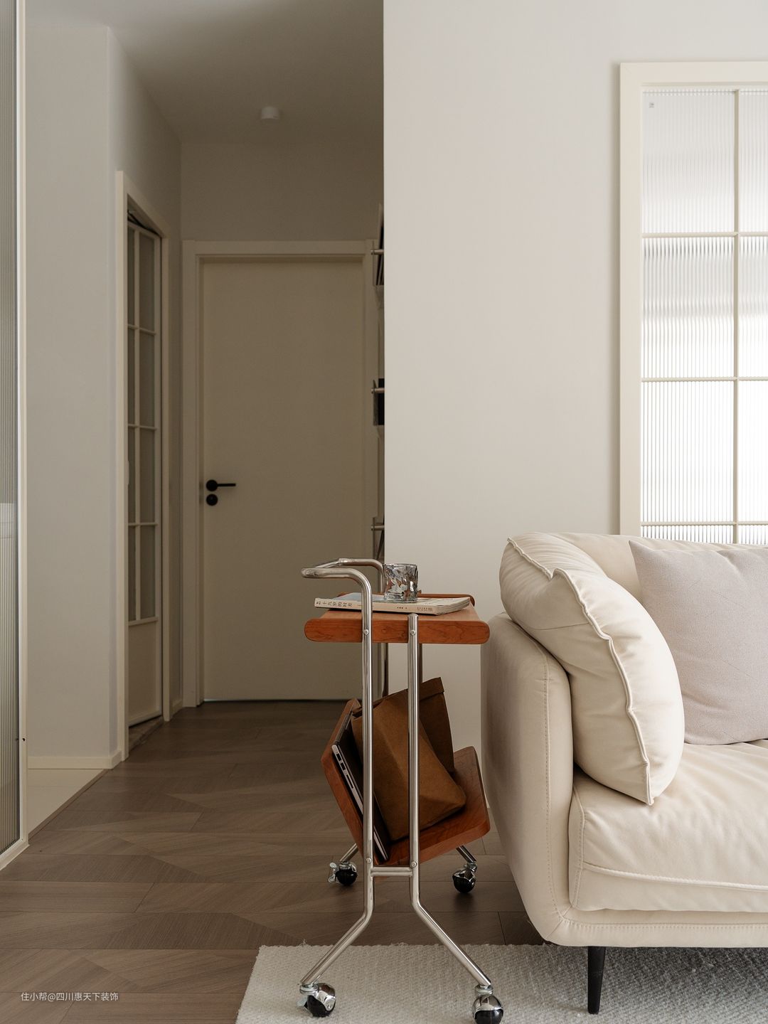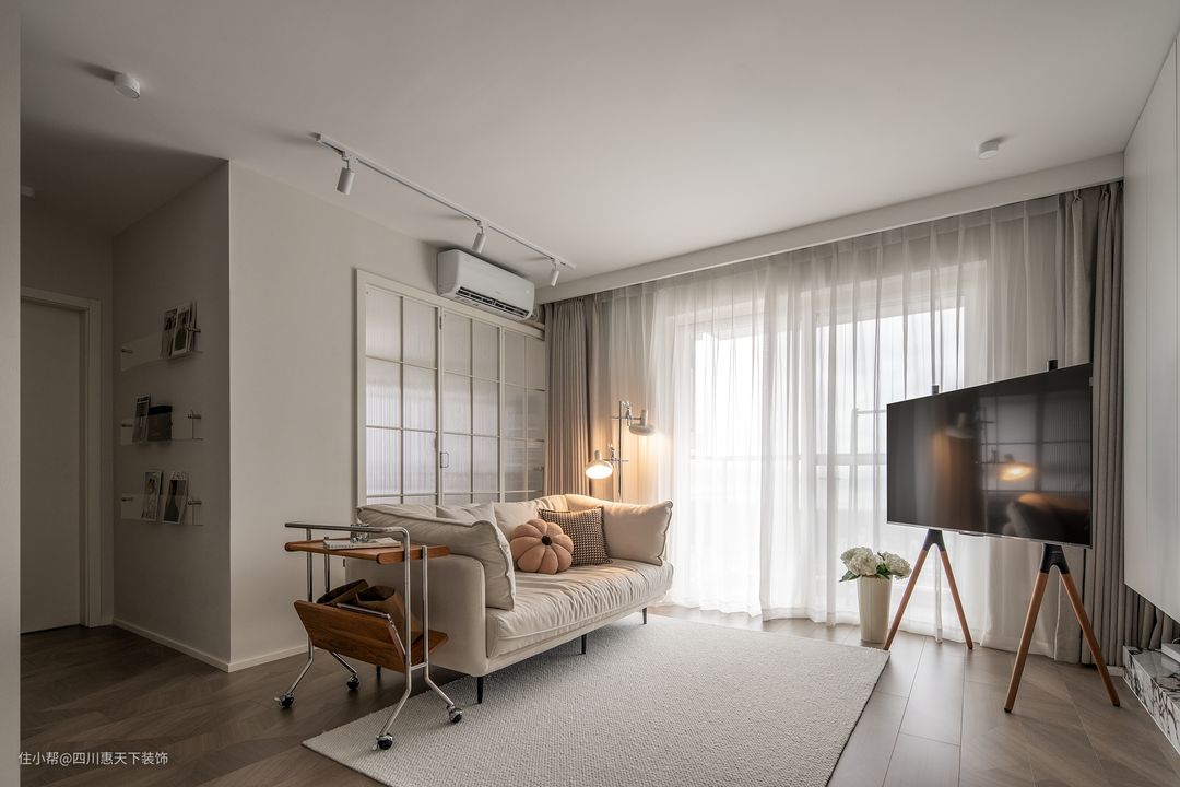 客厅用奶油色系做主调,搭配木色的家具作为点缀,深色木地板沉稳,整体看上去素雅恬静,给人一种舒适安宁的惬意感。 电视没有上墙使客厅的摆放更多变,沙发和落地灯的可移动性,丰富了客厅的使用,大面积的地毯提升了温馨感,同时在奶油色家具和墙体之间起到衔接作用。