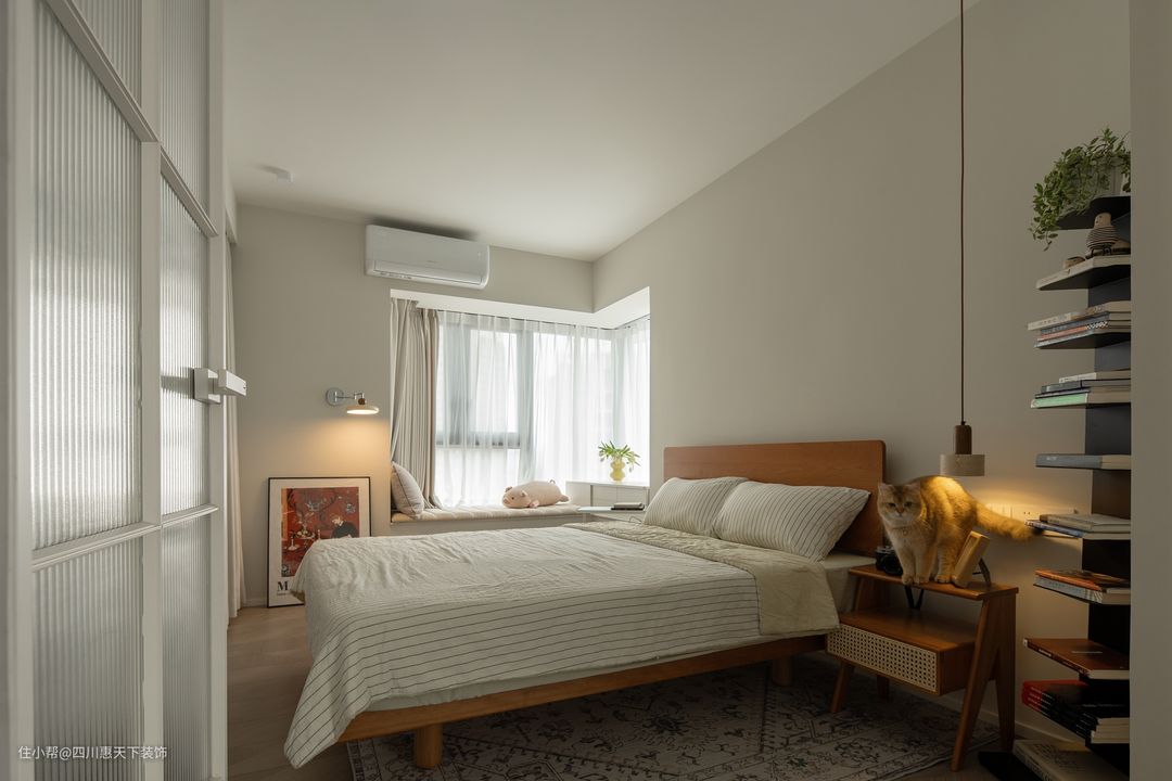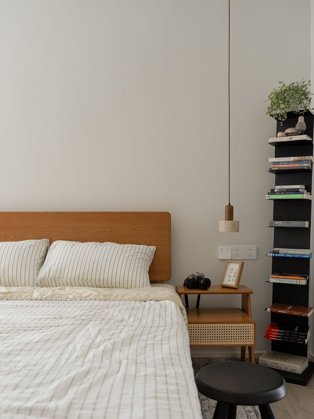 主卧以奶油色和樱桃木为主调,与全屋的色调一致。卧室主要用作休息,床是这个空间的主导位置,床边放置床头柜和吊灯,光源的多样性让空间更加灵动。分层铁艺书架,可随意摆动每层的方向,满足多种摆放方式,实用耐看。 飘窗短的一方做梳妆台,根据飘窗的面积做 深度65cm 的柜体,解决飘窗不可拆的问题,同时满足使用需求,配上定制坐垫,小憩时还能欣赏窗外的美景。