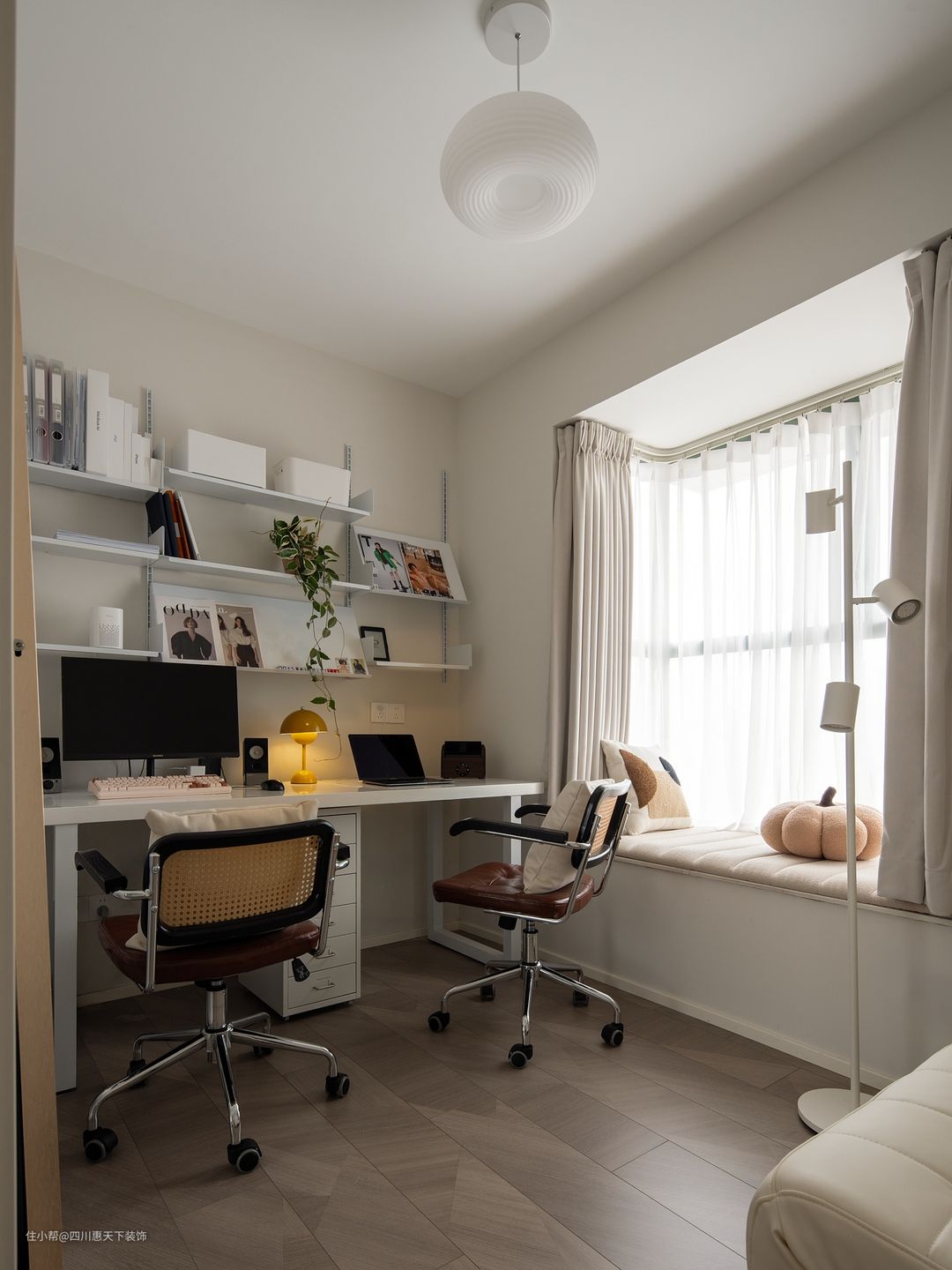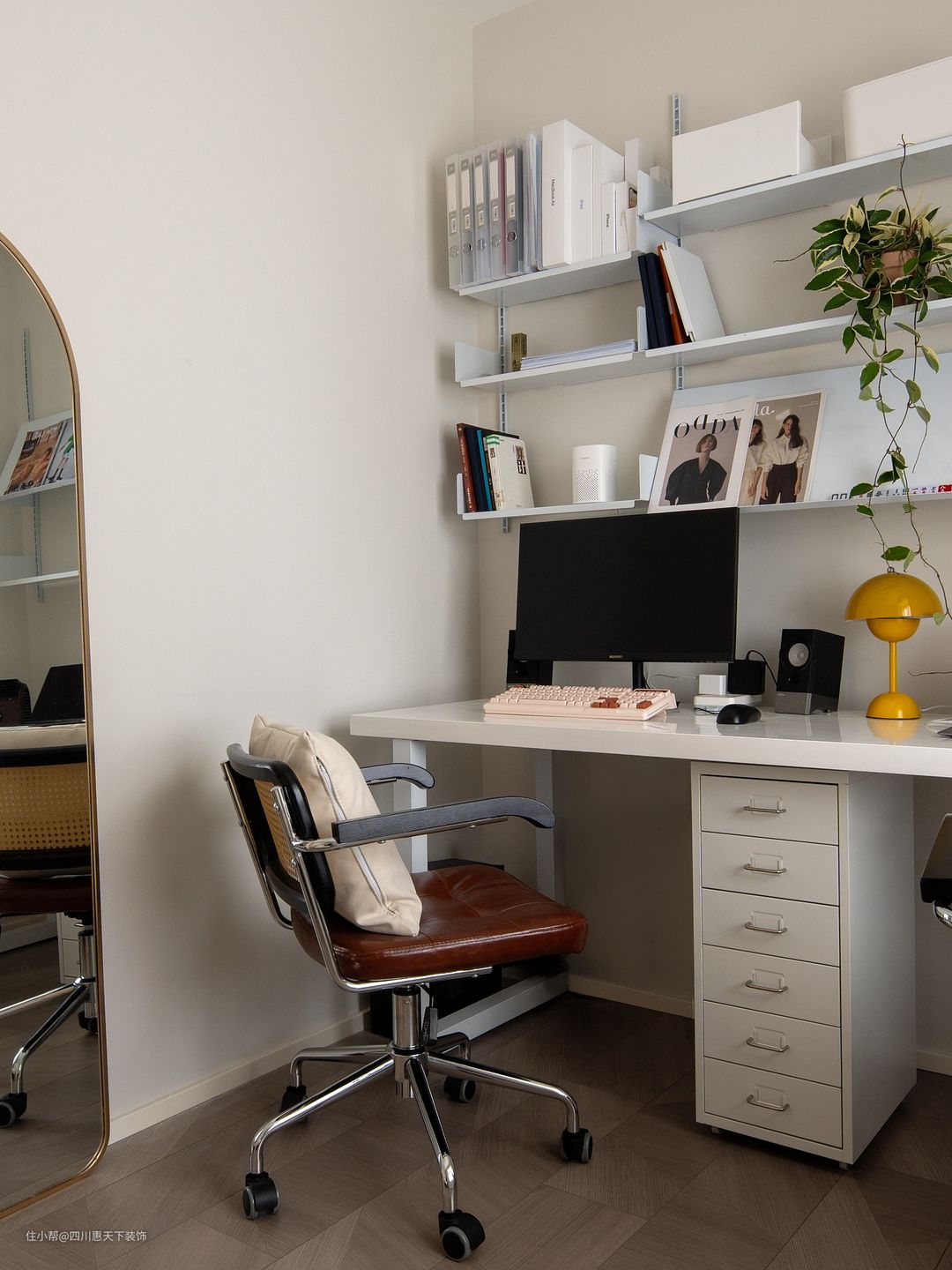 书房做双人办公桌,宽度2米,书架是可自由组装的,满足不同高度的书籍摆放,飘窗放置了定制坐垫,可以用作休息。 下方用收纳柜做划分,墙边放置了一面全身镜丰富空间的使用。