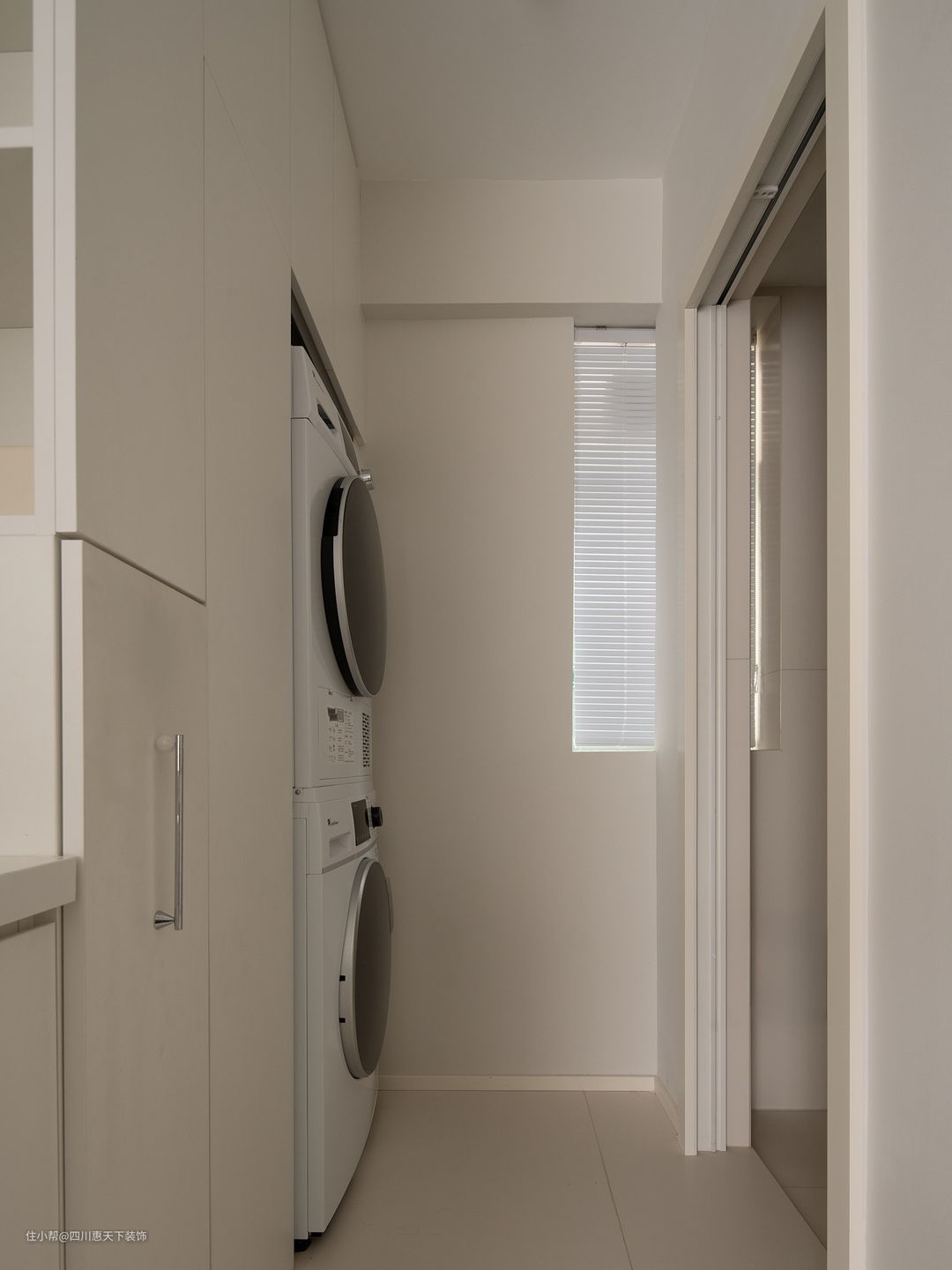卫生间借餐厅的部分面积进行外扩,做四分离布局,集洗漱、洗衣、马桶、洗浴于一体的多功能空间,满足错峰使用的需求,长虹玻璃做洗漱台的隔断,采光更好。 马桶区用折叠推拉门,节省空间,与淋浴区用长虹玻璃做隔断,空间更通透明亮。