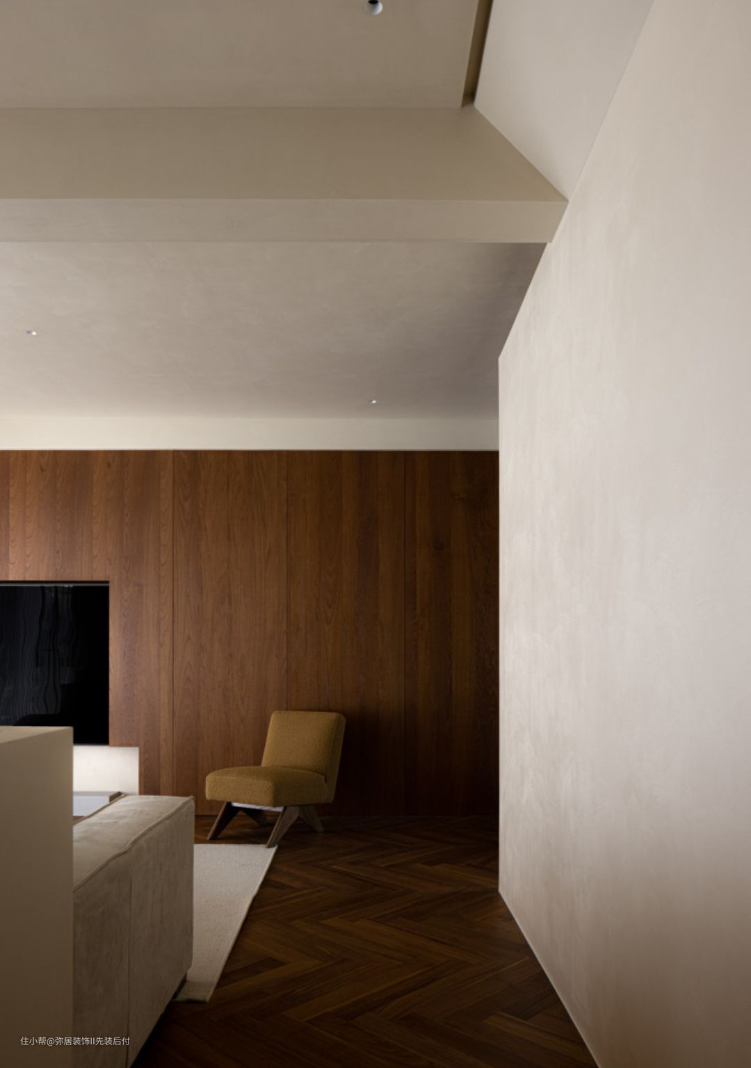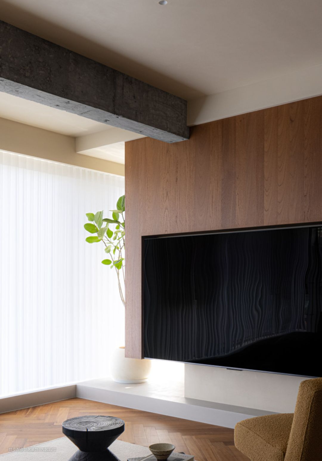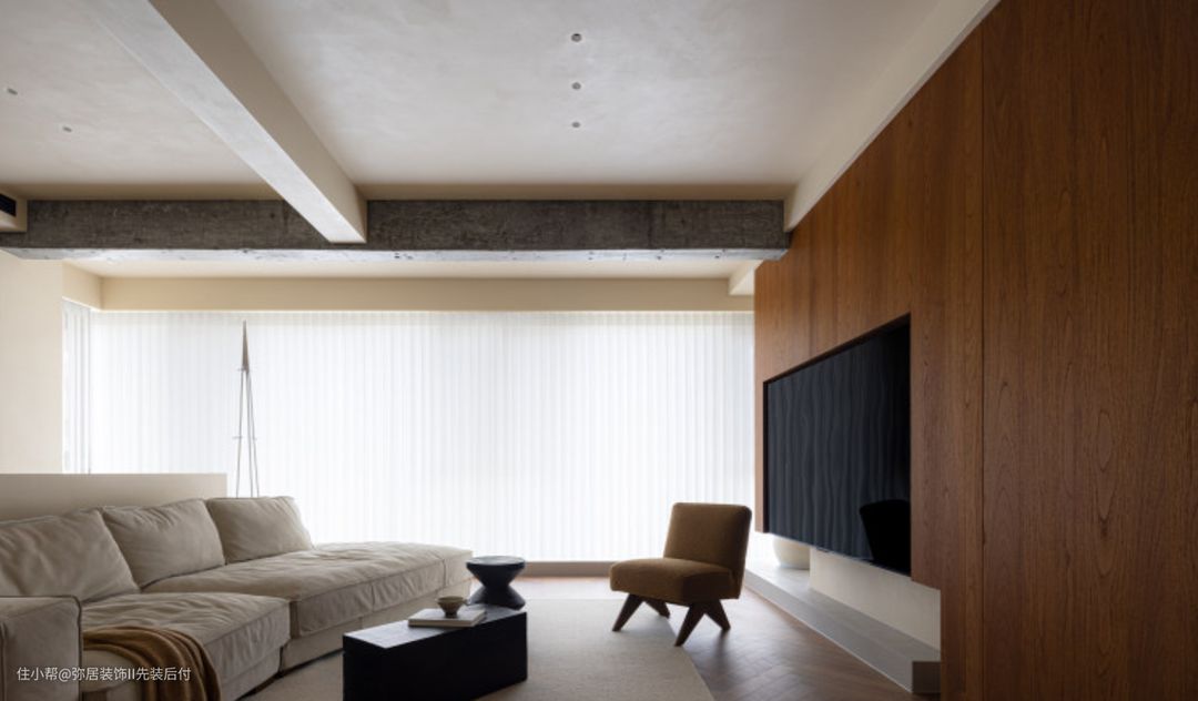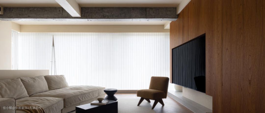 将原先的阳台纳入客厅,为客厅区扩容,人字形实木地板与阳台连通,木色上下呼 应,整个起居空间一气呵成,显得宽敞大气。 电视背景墙做了木饰面处理,柚木的沉静与优雅扑面而来。在角落绿植映衬下,带 来森林般空旷的自然气息。 阳台地面做了高15cm的围边,与电视墙顺势围合做成 地台设计,电视墙与地台中间部分留白,错落设计,更有视觉层次感