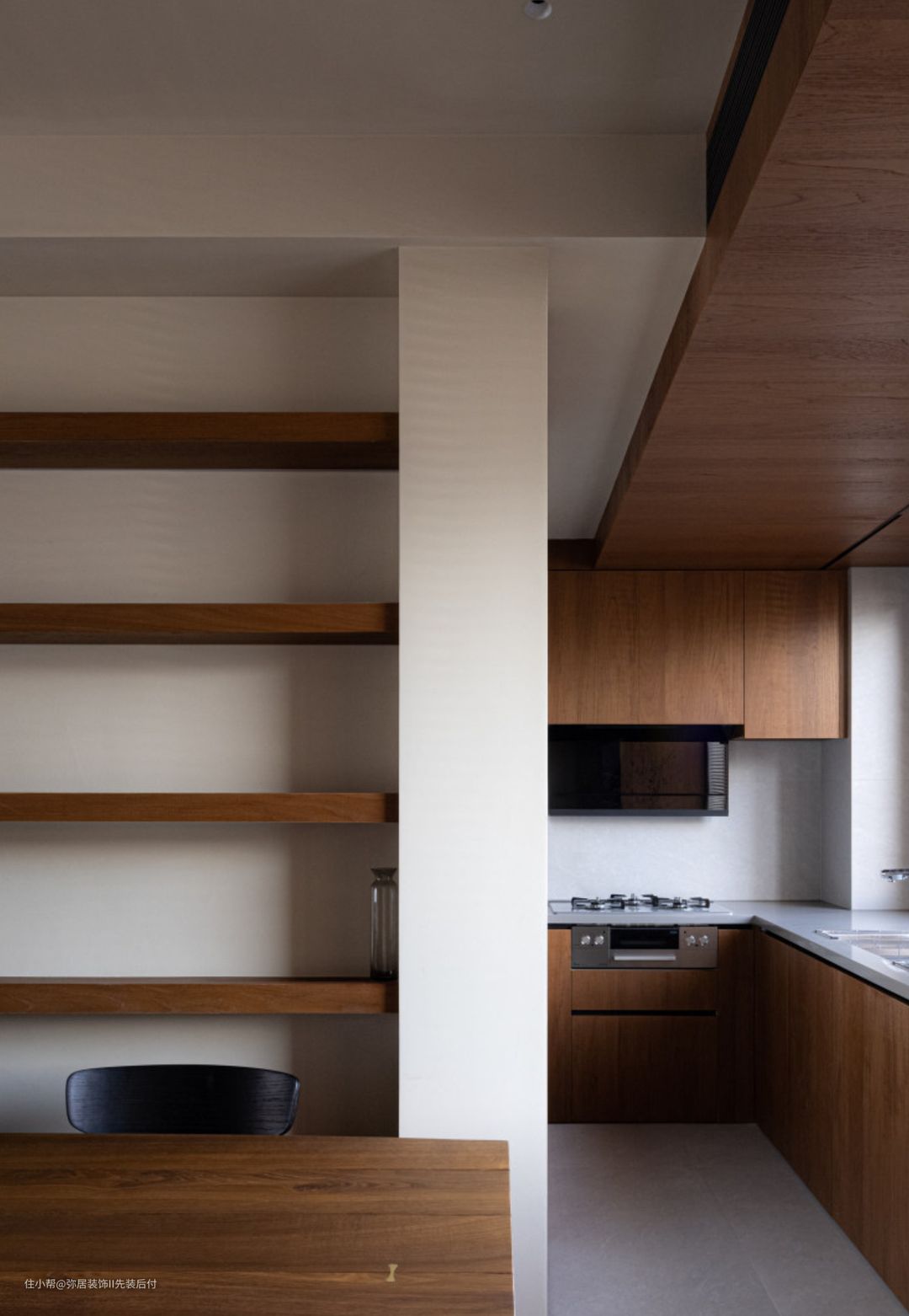 厨房顶部也以木色装饰,做了日式灶台,长条形的操作台面可以满足屋主烘焙的需 求。 吊柜与底柜都以同色系木色为主,浑然一体。