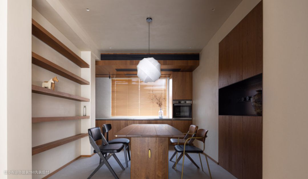 U形厨房做成开放式设计,与餐厅连通,形成一个更加开放通透的餐厨空间。 餐厅 一面做实木搁板的墙面设计,一面做了内嵌铁艺柜的餐边柜。将美感与实用融为一 体。 一张大台面的实木餐桌搭配造型各异的餐椅,在原木色的笼罩下显得森系十足, 木色与厨房出的百叶窗呼应,在这样的环境中烹饪或用餐,心情都会不由自主变得美好起来。