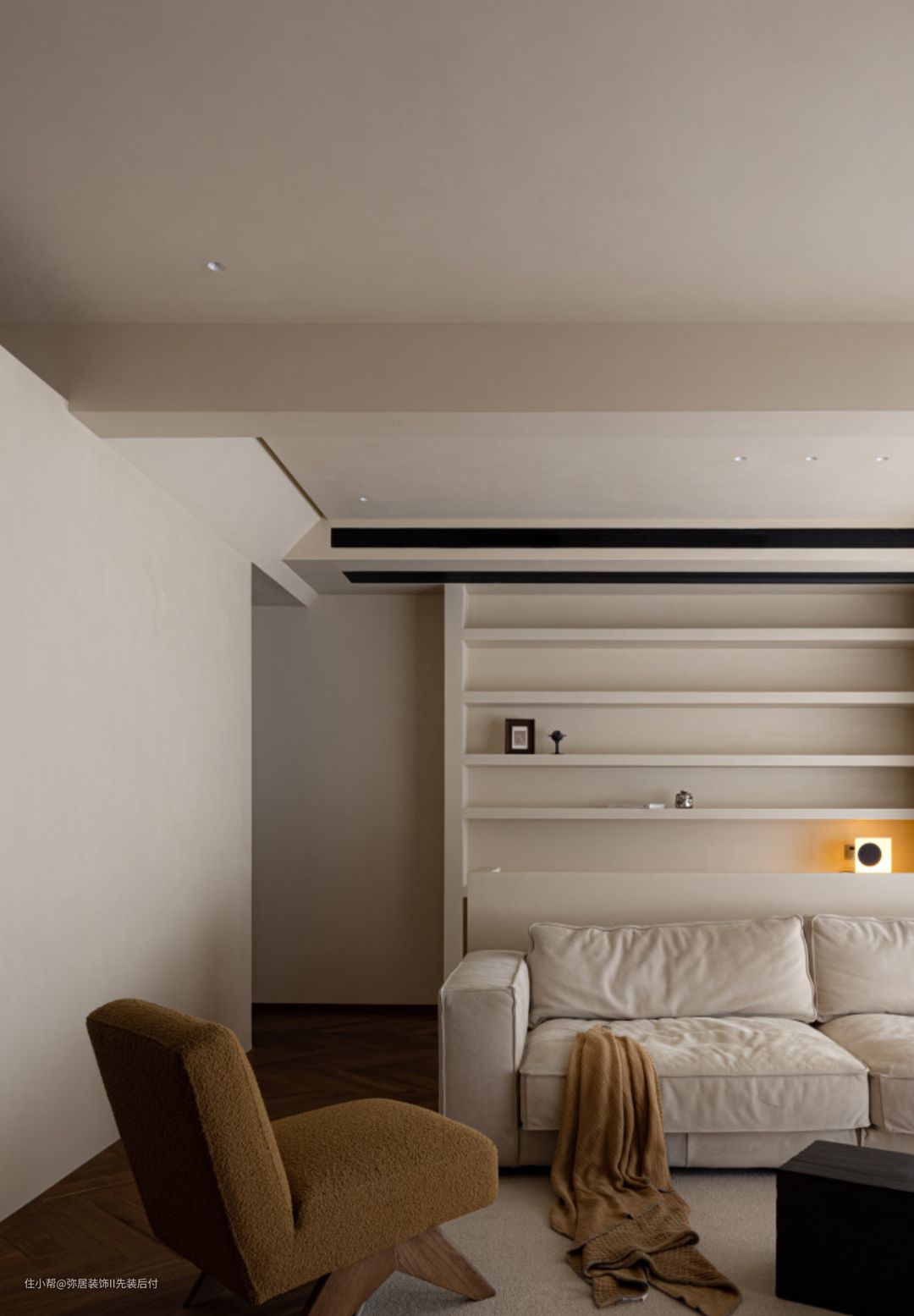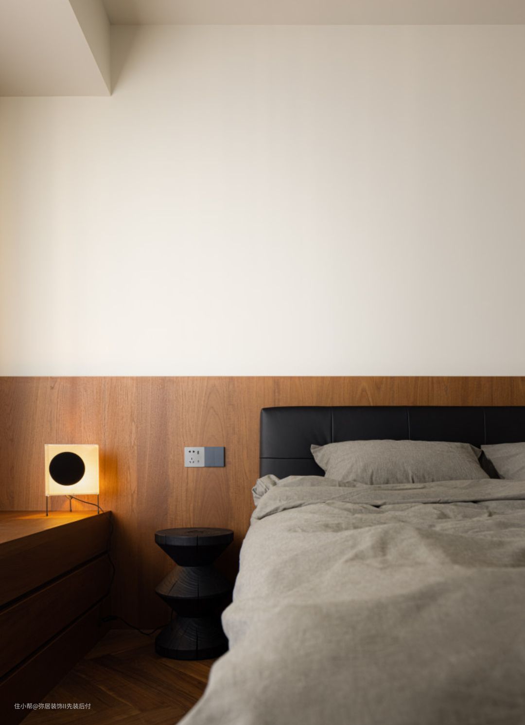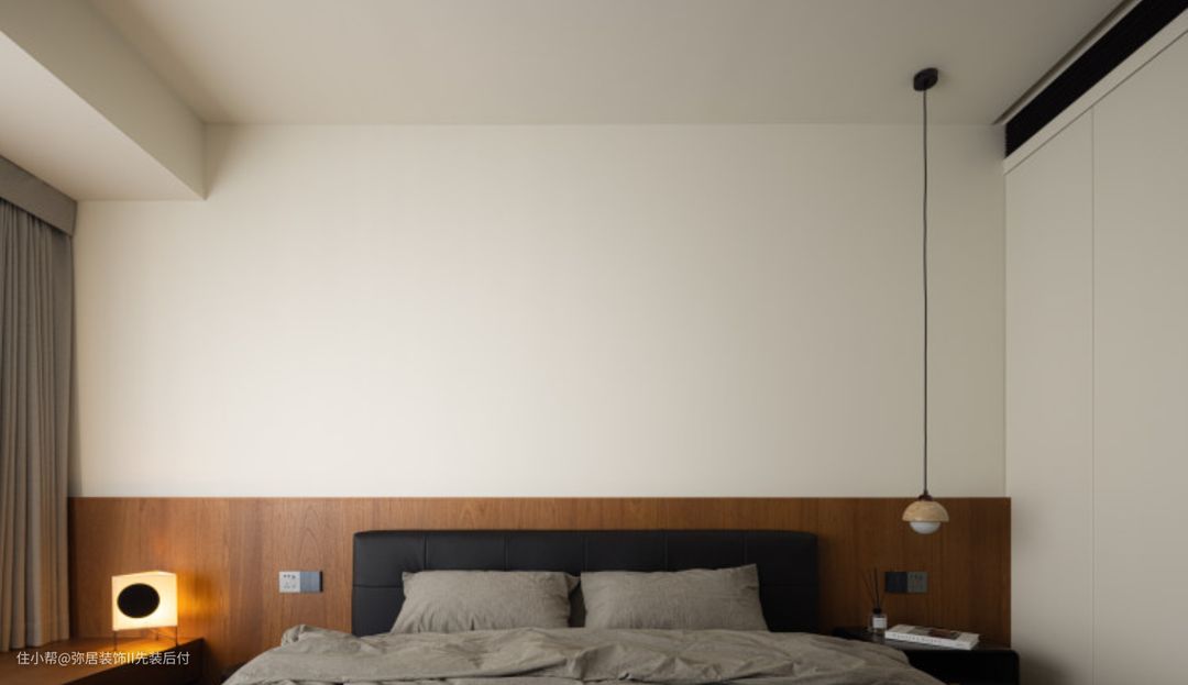 主卧的风格延续主基调。木饰面半墙设计增加空间暖度,大面积的纯白色有利于让 思绪放空,进入睡眠和休息状态。 靠墙处做了一整面白色储物柜,大量的储藏空 间可以收纳四季衣物。