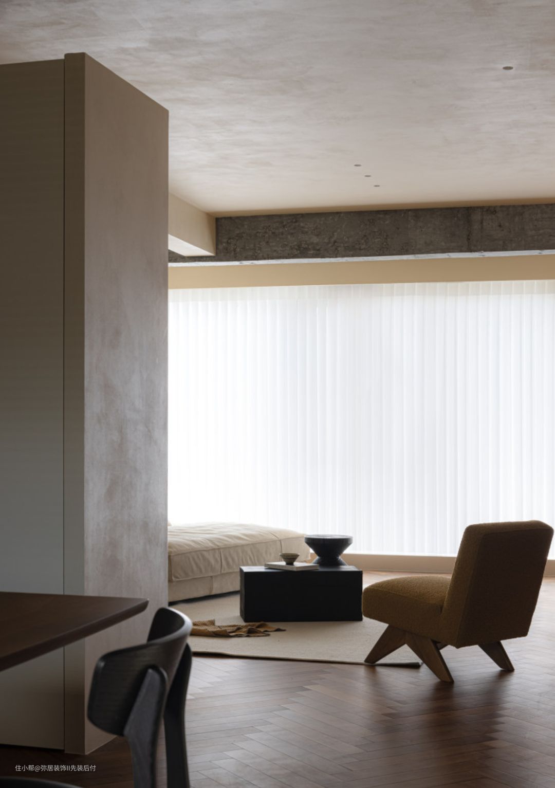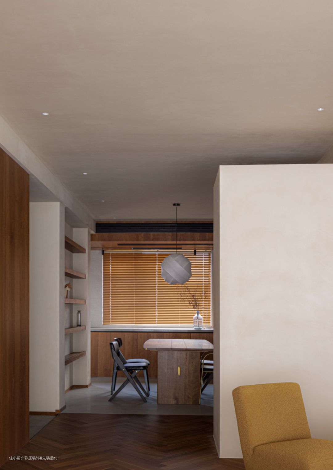 布局相对开放通透,方便家人之间更好互动。所以最终的设计方案,保留纯净的底色,带点轻侘寂的风格,同时将开放式厨房、开放式书房、客餐厅等功能区串联起来,形成一个舒适性更高的起居空间。