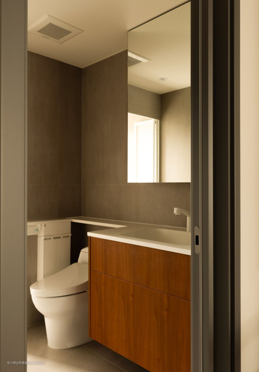 延续房子的整体风格,灰色墙地面+柚木色搭配,定制杜邦可耐丽一体盆,解决卫 生死角。 床头灯没有做对称设计,一侧用小巧可爱的吊灯来提供睡前的照明,巧妙点缀没有 喧宾夺主之感。
