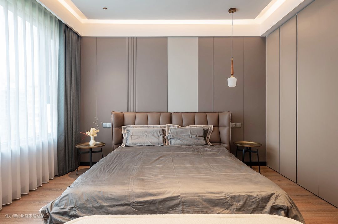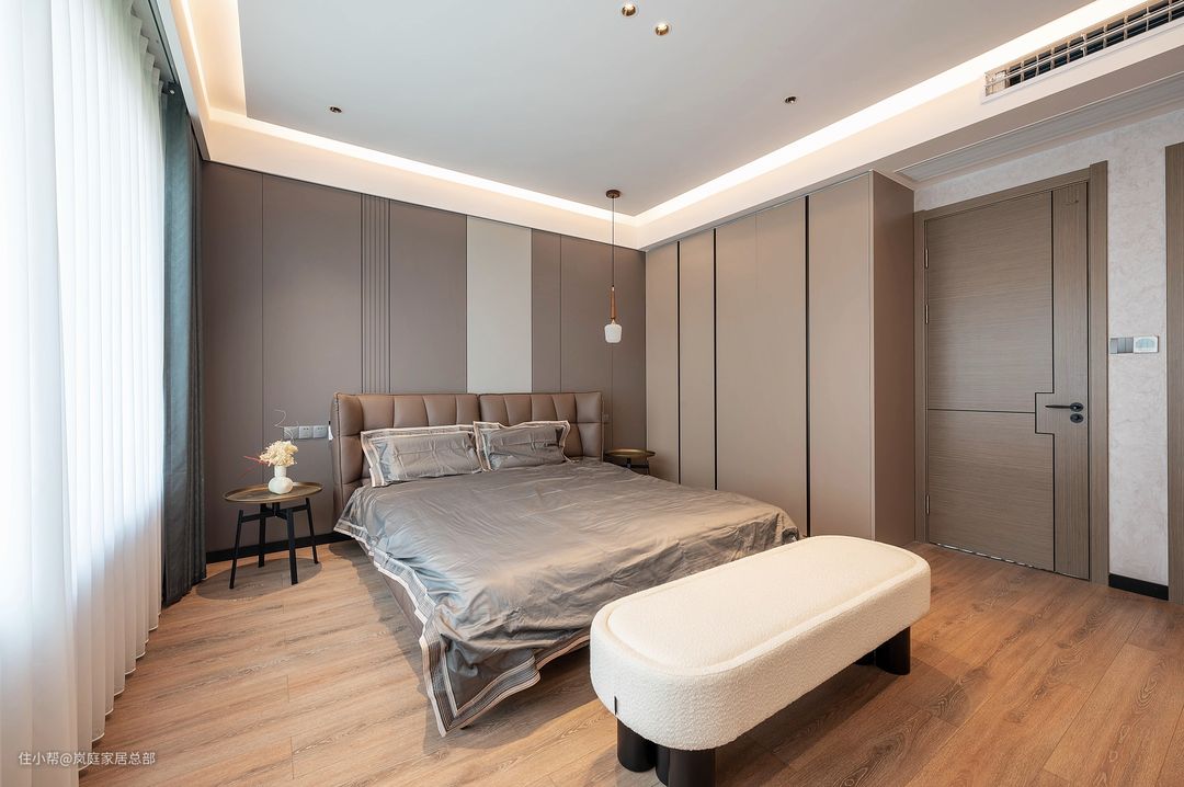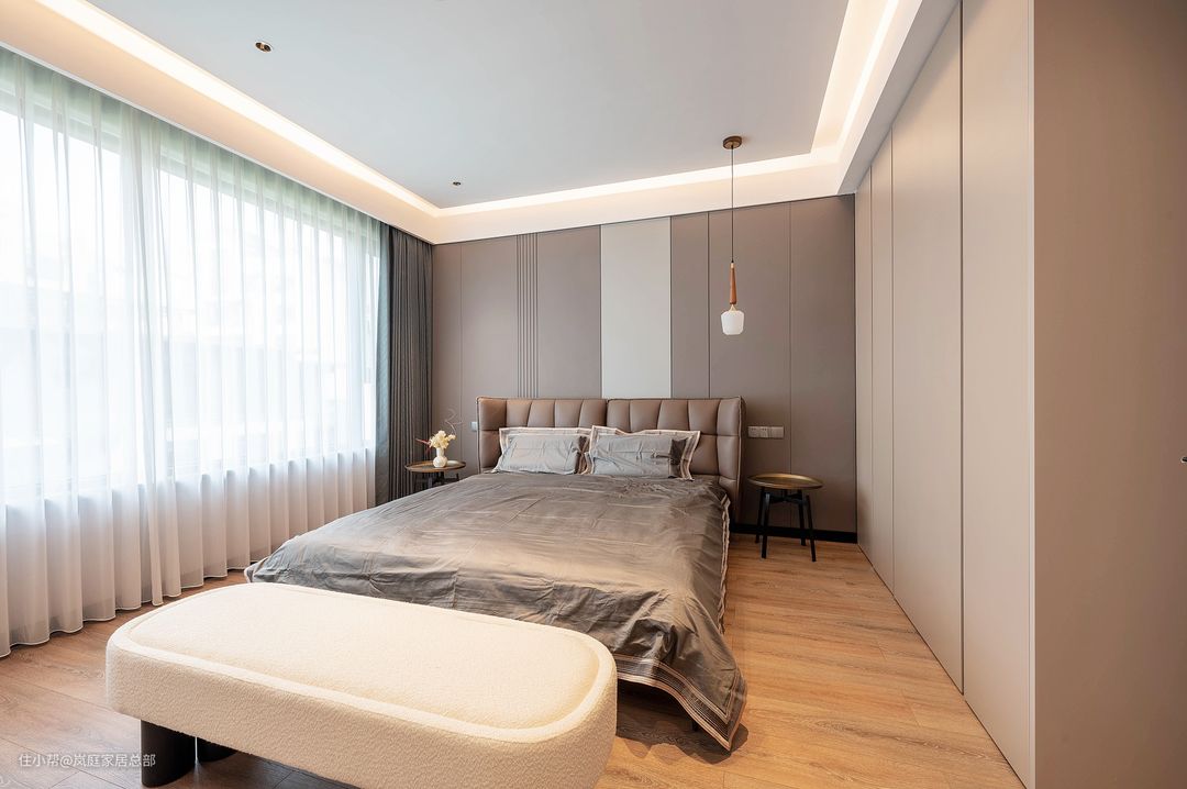 主卧的面积还是比较宽敞的,规划了独立的衣帽间和卫生间。但是为了满足业主夫妇对收纳的需求,所以在床侧也做了一组衣柜。 床头背景墙选择了深浅不一的护墙板结合,棕色和灰色的结合,通过色彩的融合,给卧室增添更丰富的层次。 卧室还做了流行的悬浮式+无主灯的吊顶设计,用灯带做主要照明,适当去繁从简,体现出极简风的与众不同。 二楼的卧室则是铺贴了天然的木地板,比起地砖来说,能更轻松营造温馨舒适的睡眠环境,脚感也更舒适,不易过时。