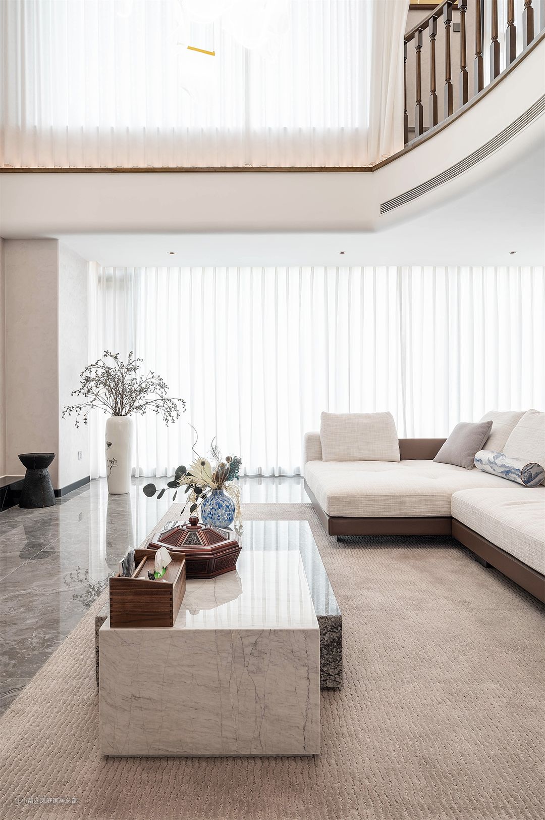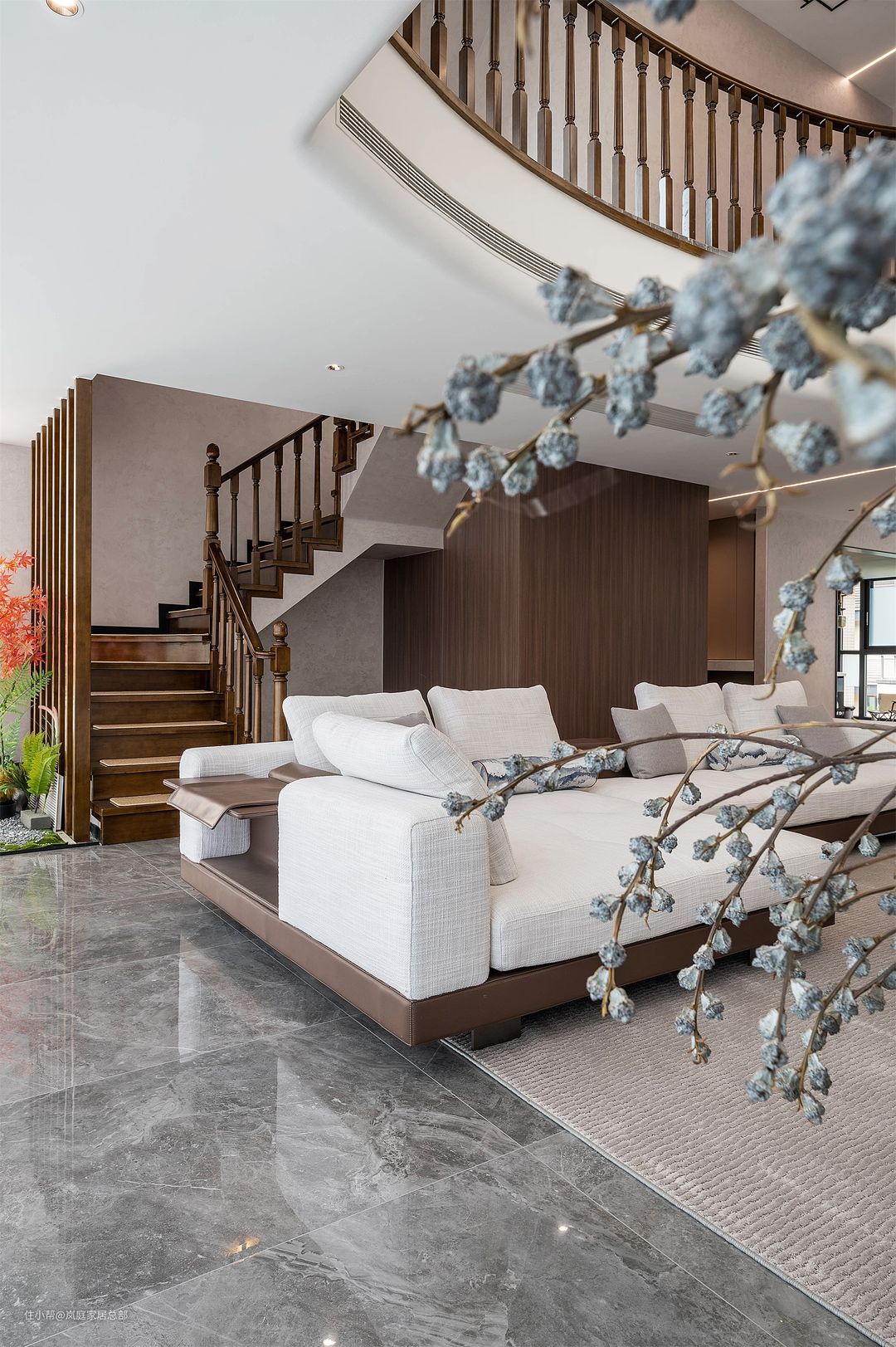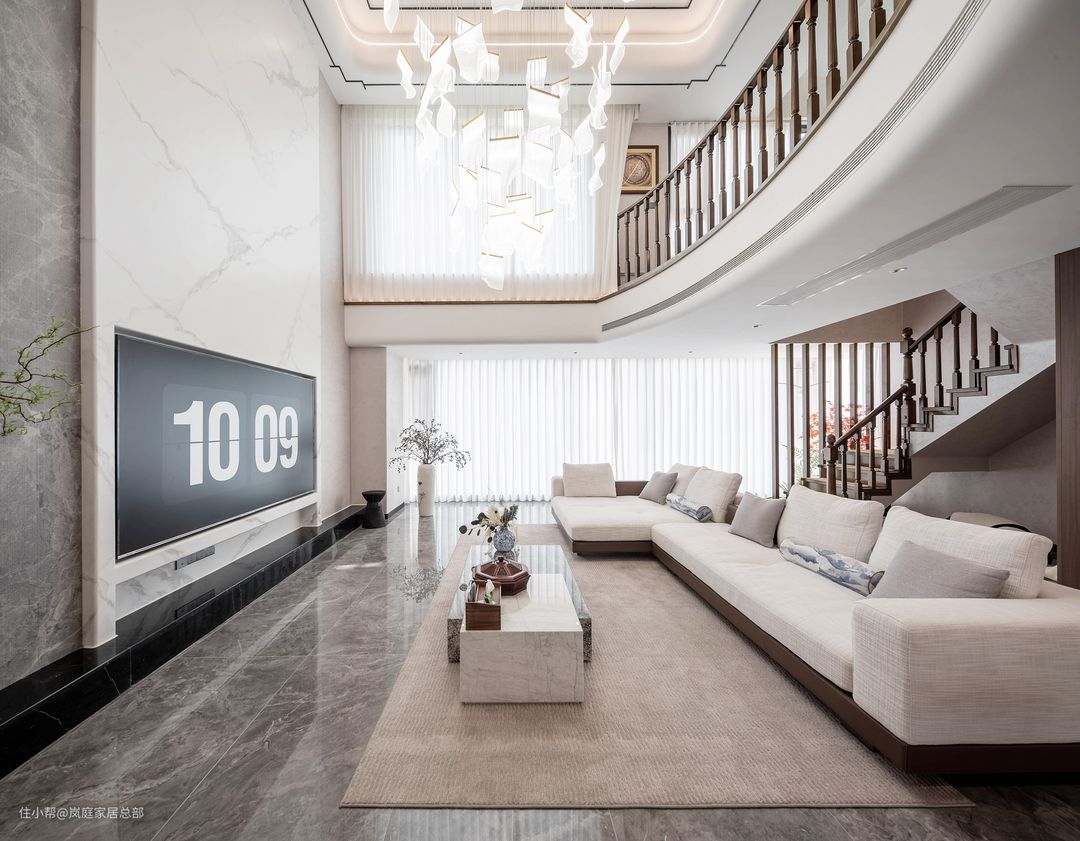 别墅户型,客厅二楼做了挑空,并且还将吊顶塑形做了弧形的设计,在线条的组合下,让家更显柔和温暖,不会大量留白而显得单调。 电视背景墙是非常具有现代特色的拼接造型,白色和灰色的瓷砖上墙,还做了悬浮式+地台的造型,即使是挑高的户型,也不会觉得突兀。 吊顶做了方形的设计,还加入了黑色线条点缀,丰富视觉效果。边角也做了弧形的处理,擅用曲线元素,让家更具温馨舒适的氛围。 地面选用灰色的地砖通铺,颇具现代特色的款式,也是成就这个家的关键。在整体色彩的融合下,将现代流行的质感展现得淋漓尽致。 沙发背后的楼梯也都做了木栏杆的设计,延续中式古典的韵味。背景墙上还做了木板上墙,安装隐形门,看上去更美观。