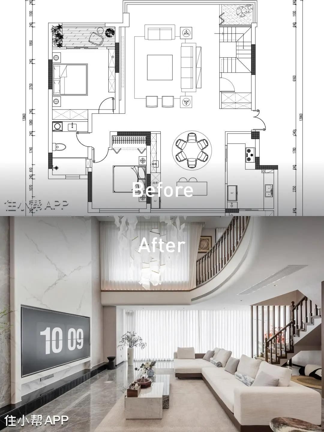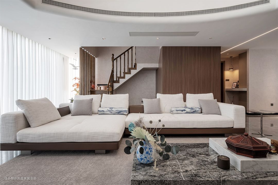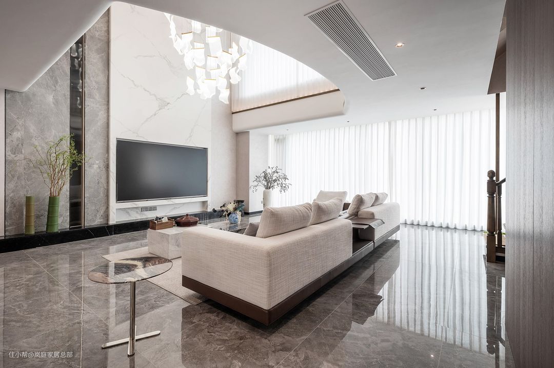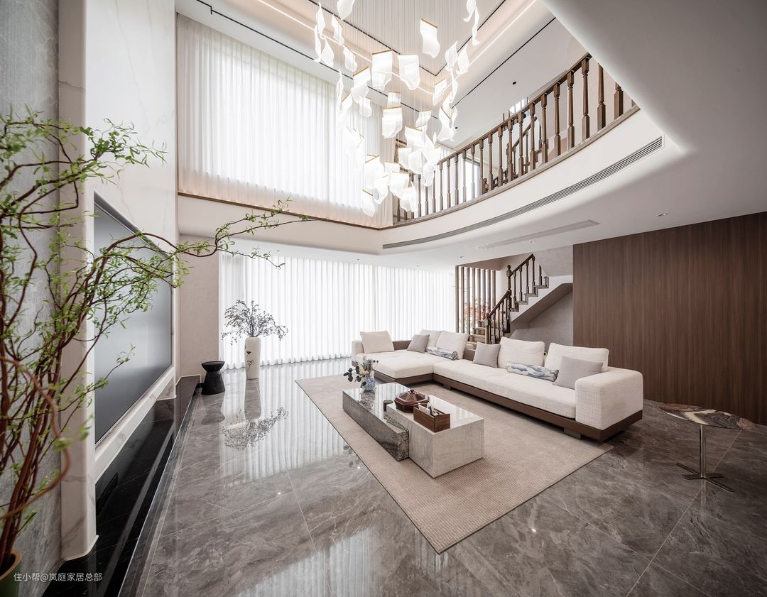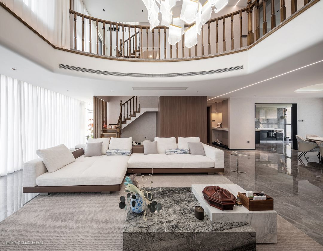 整个家改动最大的就是客厅,将客厅做了挑高处理,并且将吊顶改成了弧形,圆润的线条给家带来不一样的温馨氛围,也让客厅看上去更加气派,突出别墅优势。 整个家大量运用了现代简约风的手法来打造空间,融合古典中式的经典元素,最终成就了一个高端时尚的家。