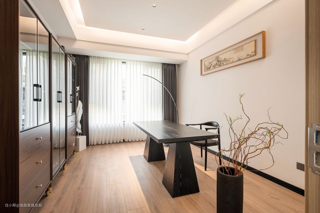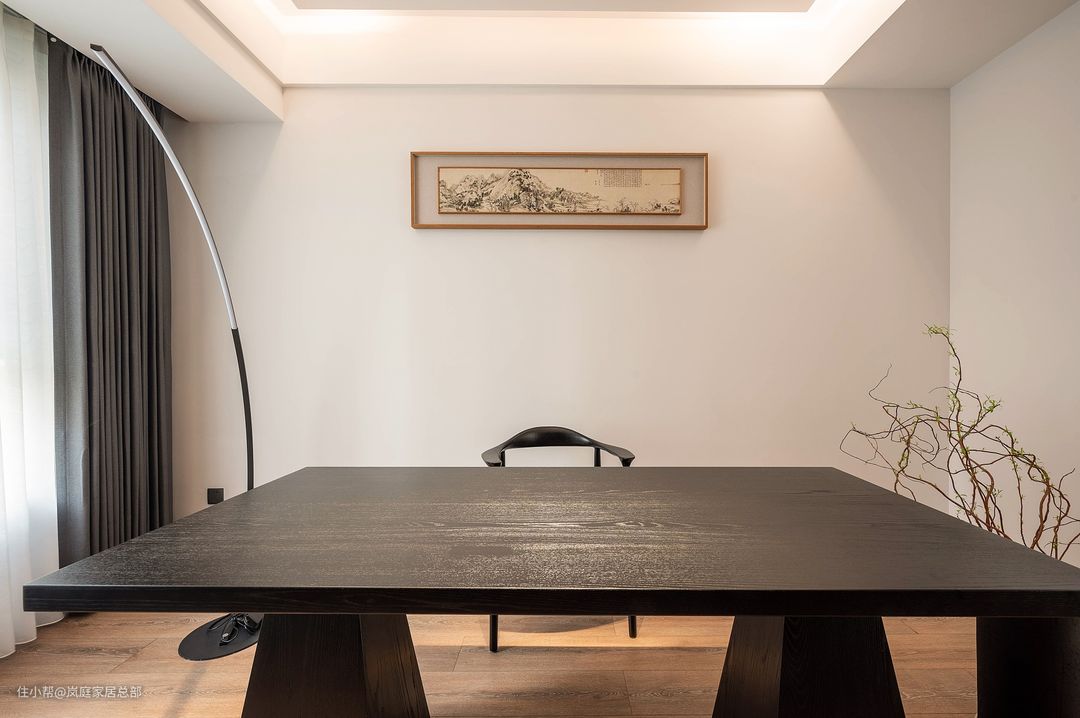 其中一间小次卧根据业主一家的居住需求改成了独立的书房,安装了一组成品书柜,颇具古典中式的特色,深色实木的款式,沉稳内敛又实用。 摆放上同款黑色的实木书桌椅,古典韵味十足,在这里办公无疑是一处宁静惬意的好去处。墙面上方的装饰画就极具中式风特色,体现新中式风的独到之处。
