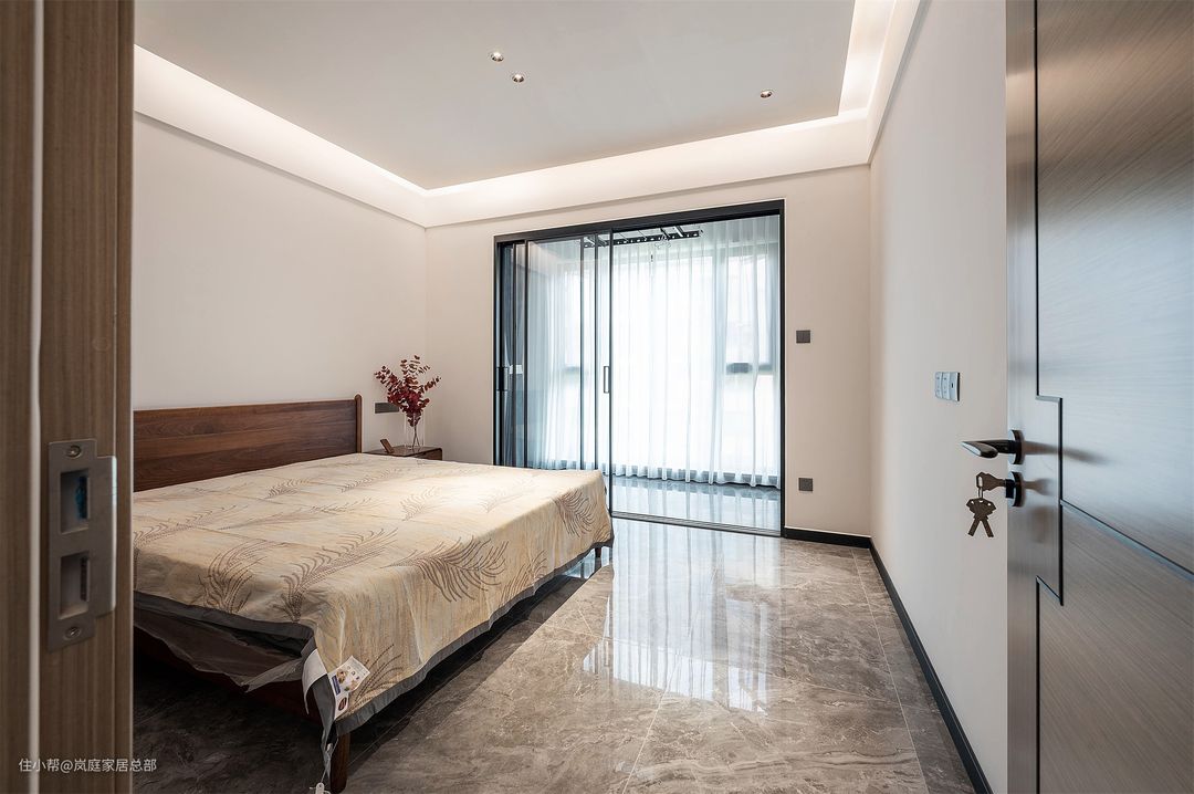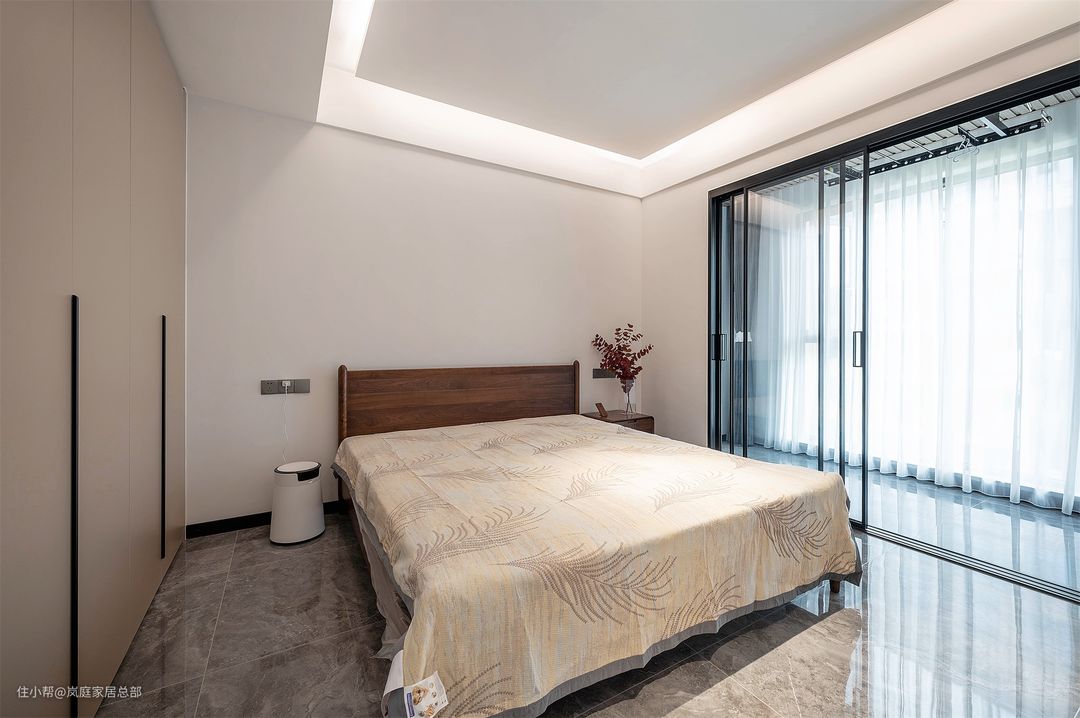 次卧带有一个阳台,阳台做了落地窗封窗,卧室跟阳台之间则是采用透光性好的玻璃门隔断,不影响室内采光。 阳台空间也没有浪费,在这里安装了可升降的晾衣杆,有效利用空间,也解决了基本晾晒衣物的问题。 背景墙并没有做过多的设计,不过吊顶却是延续了悬浮式和无主灯的设计,简约精致的搭配,更能体现极简的精髓。