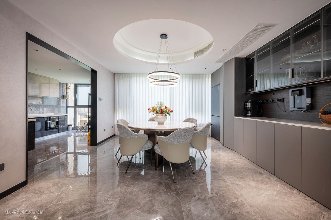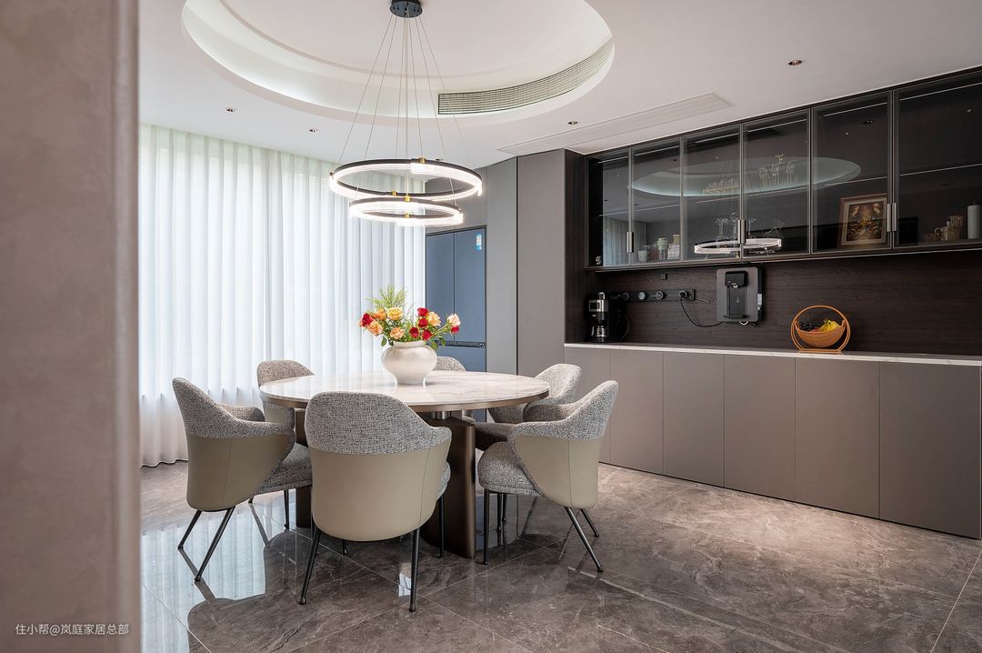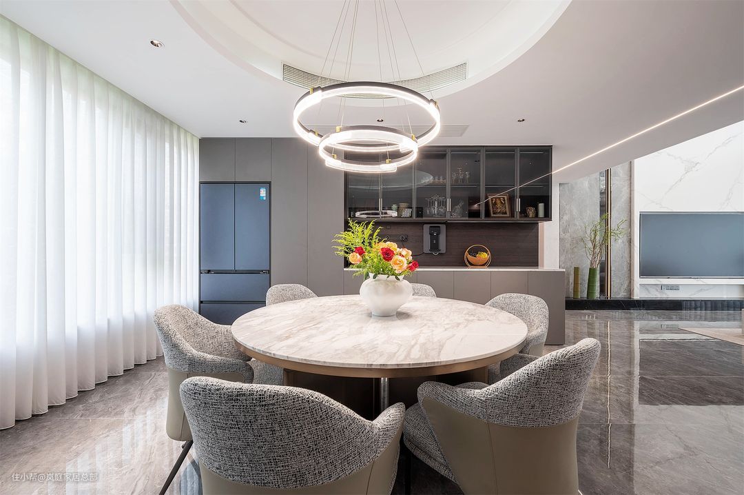 餐厅因为做了圆形的吊顶,所以特意选择了圆形的餐桌,还有圆形的吊灯,线条灯带组合的吊灯,简约中又多了一丝高级精致感。 方中有圆,也是传统中式的一大代表。标配的六人桌,对于一家人来说也够用了,灰白配的组合,跟硬装色彩也都是契合的。