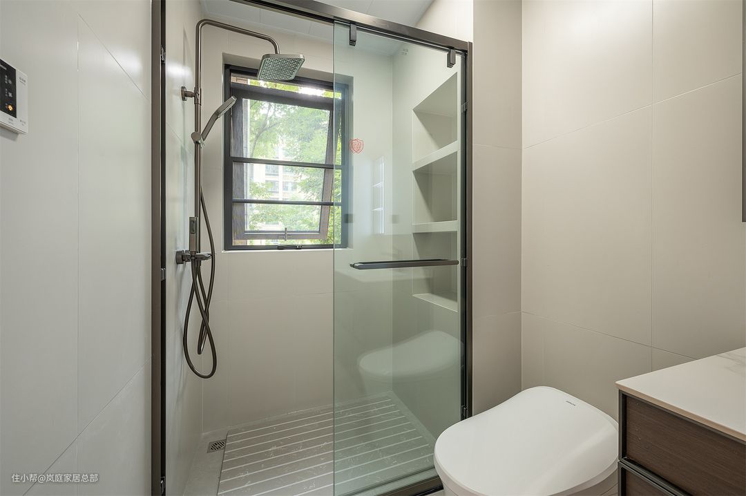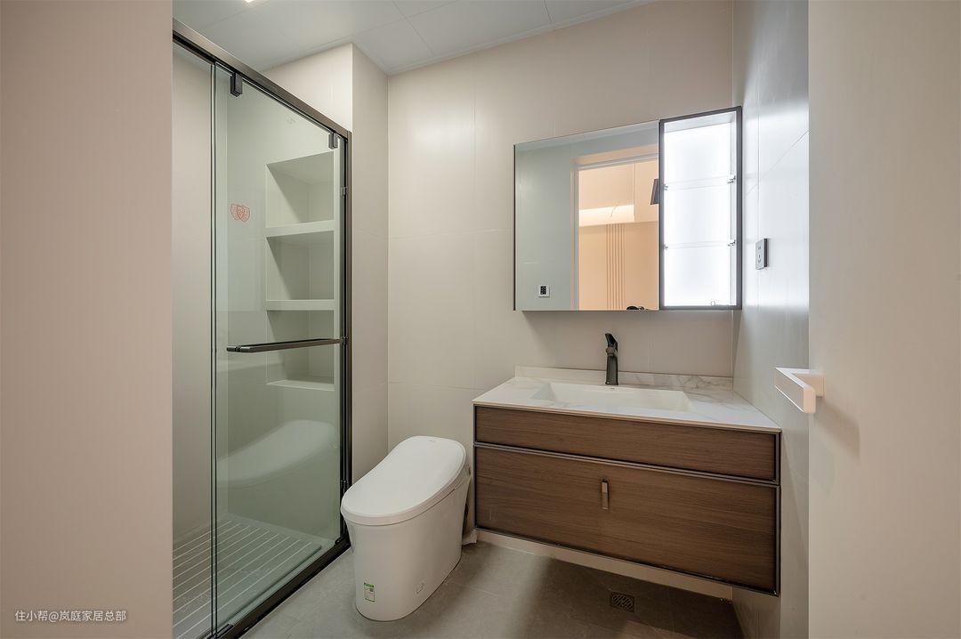 卫生间做了一字型的布局,将最里面的淋浴区用玻璃门隔断,保证了基本的干湿分离。淋浴区地面还特意铺了防滑地砖,墙面上方还挖洞做了壁龛储物,提升实用性。 墙地面通铺白色的瓷砖,一体式的搭配,对于采光不是特别足的空间来说更友好。而且白色的柔光砖,看上去更显柔和。 搭配上原木色的洗漱台,悬浮款式,底部留空无卫生死角。自带充足储物功能的镜柜,对于基本的储物需求完全能满足。