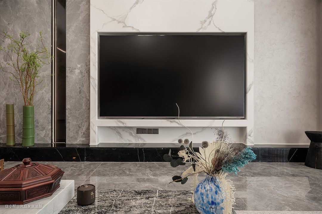 至于软装家具的搭配则更有新中式风的味道,L型的白色布艺沙发,还有木材的融合,现代极简与古典中式的元素碰撞下,呈现不一样的高端时尚气息。 茶几也是现在很流行的组合款式,灰白结合,跟硬装色彩契合。方方正正的款式,更显高端大气,不易过时。