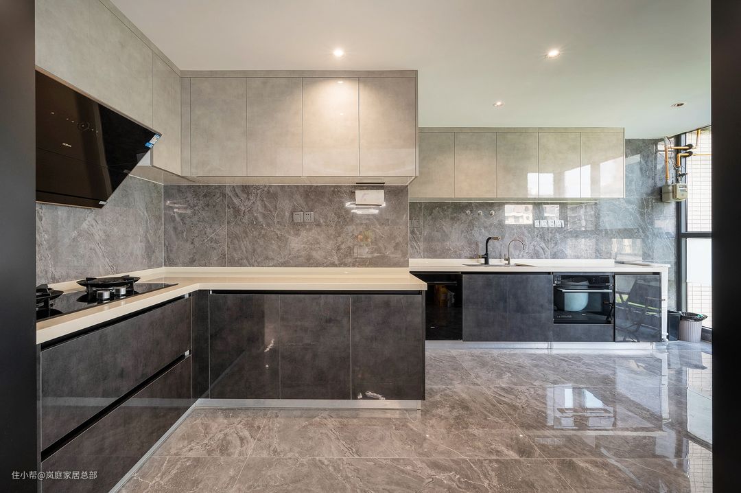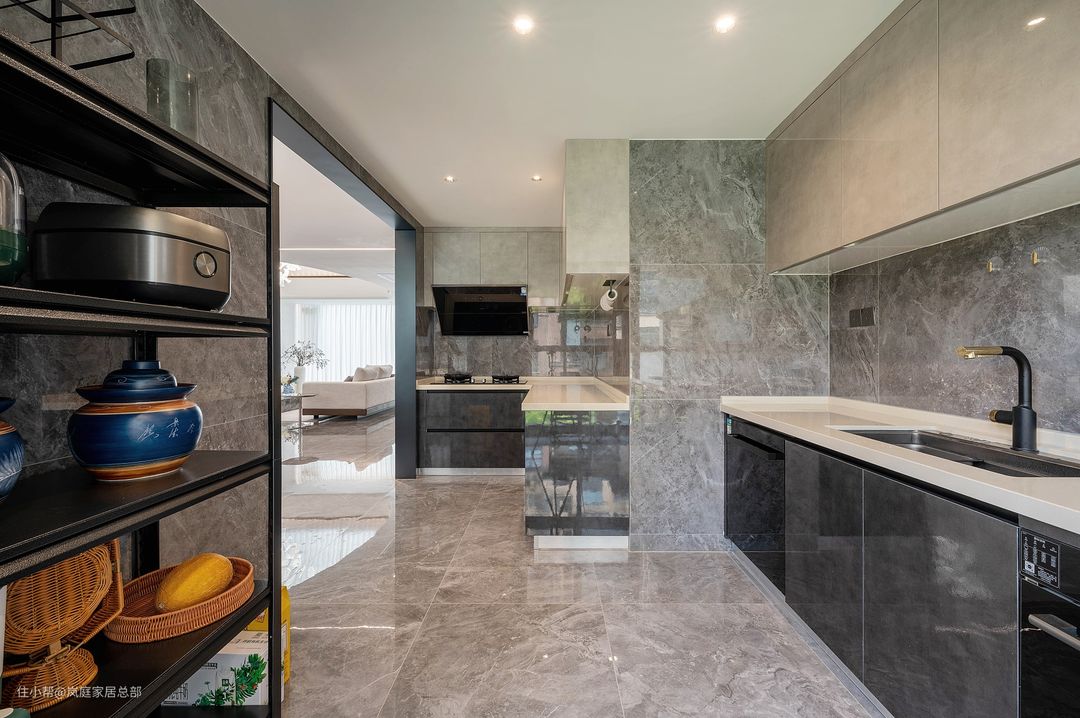 厨房跟生活阳台打通后扩大了使用面积,为了将空间都利用起来,于是做了两组操作台,把洗菜备菜和烹饪区都划分开,动线合理,即使家里人多一起做饭也不会拥挤。 墙地面通铺一体式的灰色瓷砖,耐看又好打理卫生。于是橱柜特意选择了黑色的款式,吊柜则是灰白色,整个空间运用黑白灰三色,提升层次感。 墙面上方也都做了吊柜增加收纳,将空间完美利用起来。柜子都做的无把手设计,不易磕碰,实用性也强。