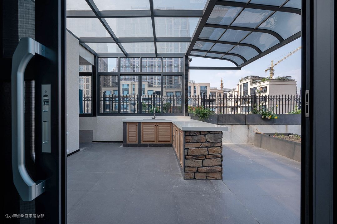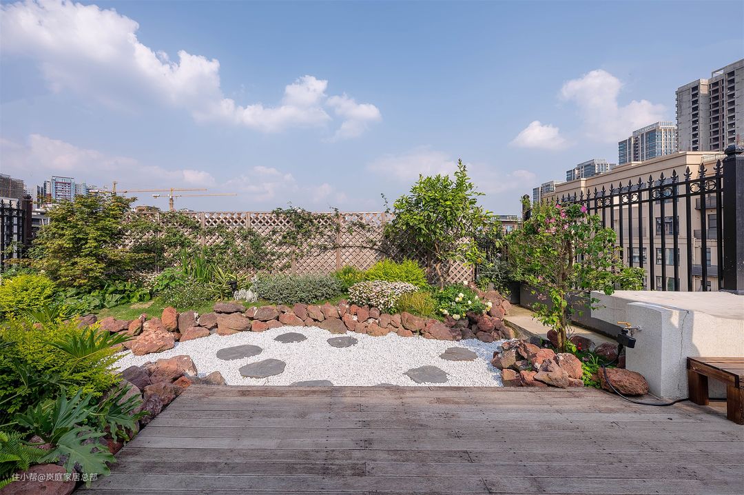 顶楼的花园面积足够宽敞,根据一家人的需求将这里搭建了部分的开放式厨房,日常使用更便利,尤其是露天烧烤更实用。 至于剩下的空间则是打造诚了露天的园林的景观,铺设鹅卵石道,移植上花草树木,闲暇时在这里看看书晒晒太阳十分惬意,在家就能感受大自然的美。