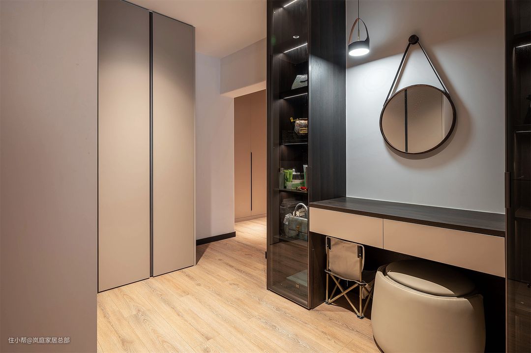 家具跟硬装色彩都是契合的,巧克力色的皮质床,高端大气感十足,也兼顾了实际的居住体验,一举两得。 衣柜是定制的一门到顶设计,搭配上无把手的设计,简约大气收纳还足,利用按压弹力器开关,实用性杠杠的。