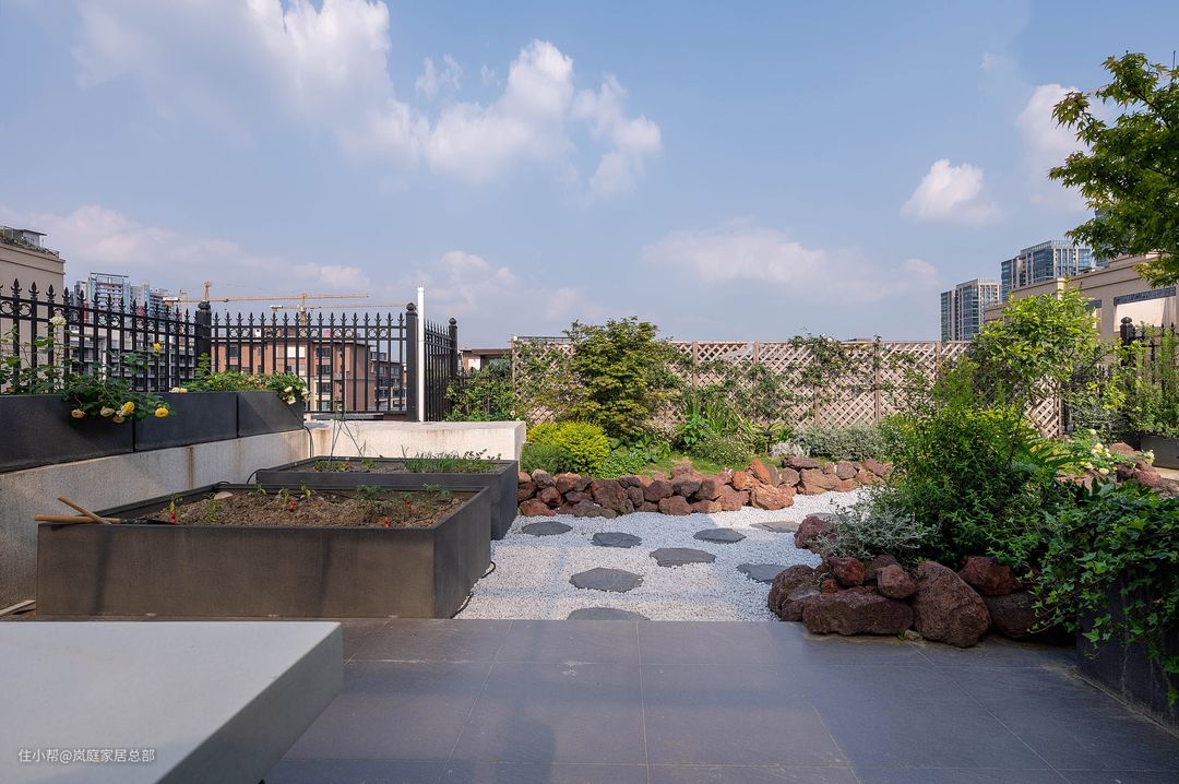 顶楼的花园面积足够宽敞,根据一家人的需求将这里搭建了部分的开放式厨房,日常使用更便利,尤其是露天烧烤更实用。 至于剩下的空间则是打造诚了露天的园林的景观,铺设鹅卵石道,移植上花草树木,闲暇时在这里看看书晒晒太阳十分惬意,在家就能感受大自然的美。
