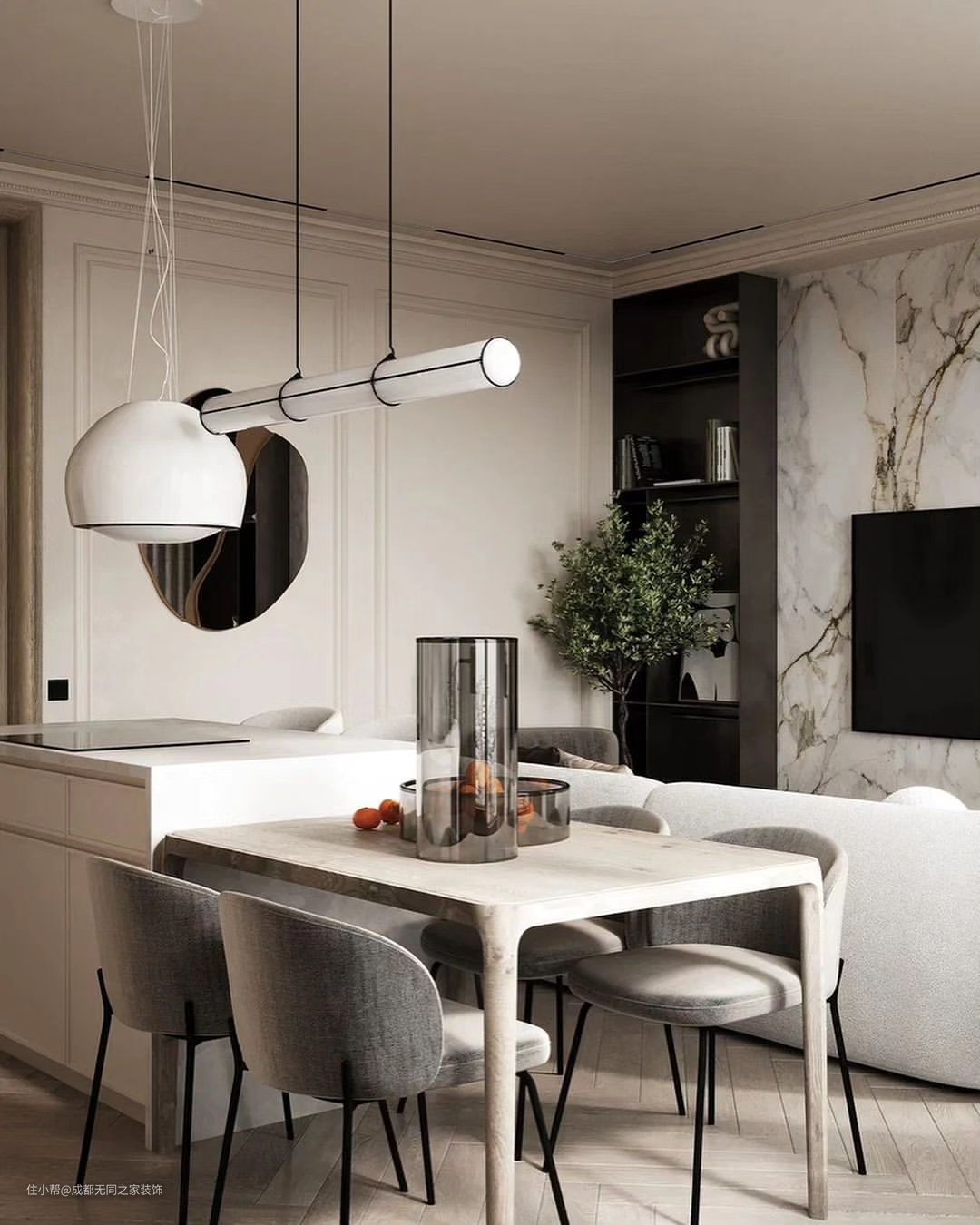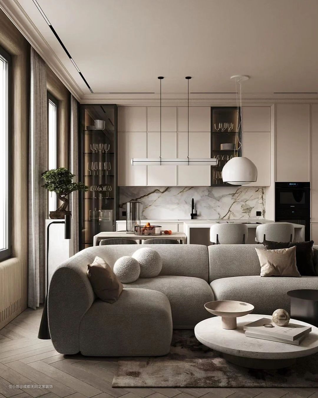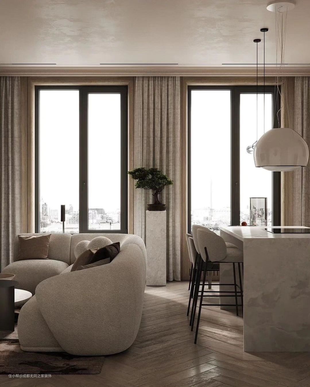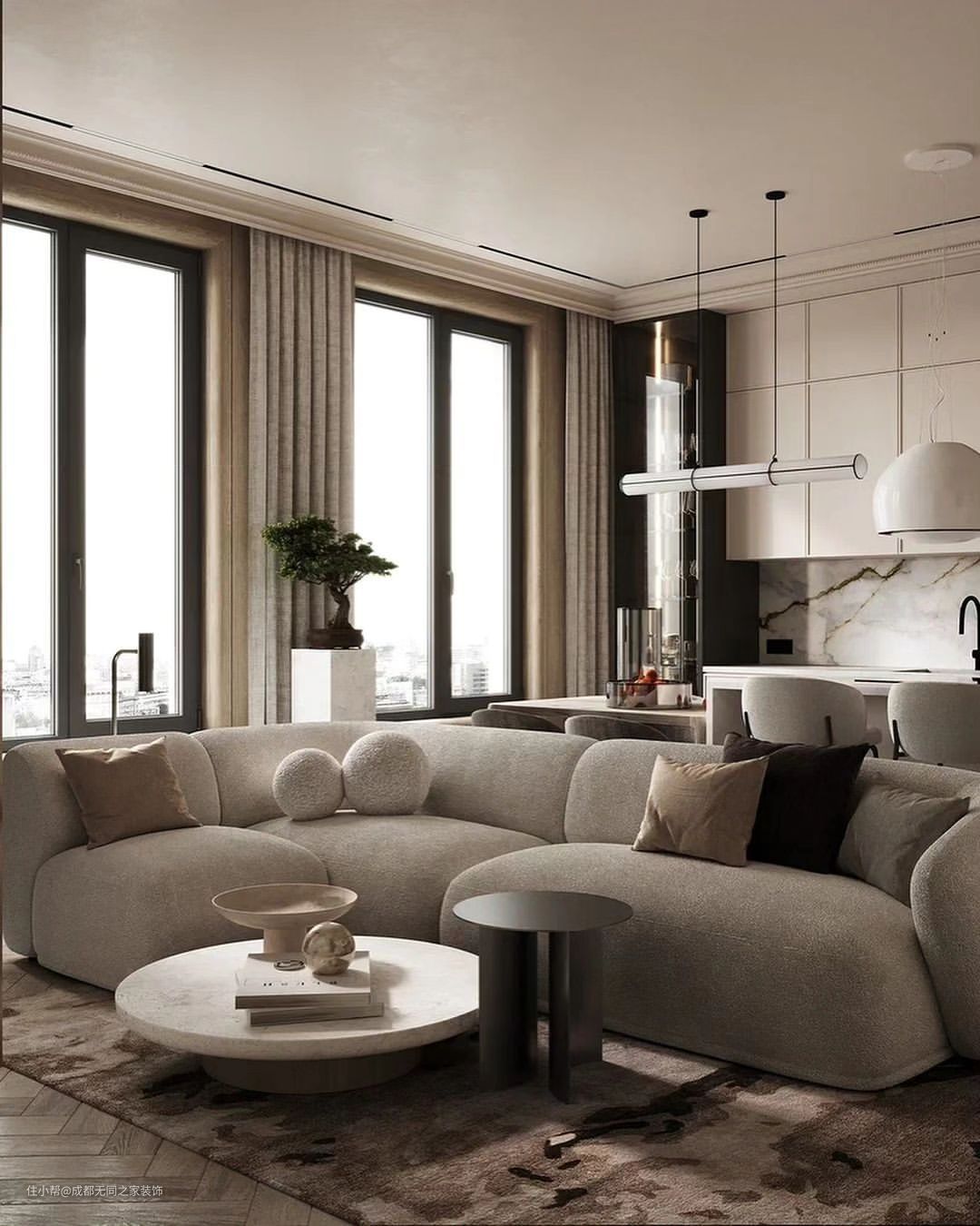 裸色为主色调,展现出极致的高级感,纯色系的客厅细节中蕴含着细腻的温柔。