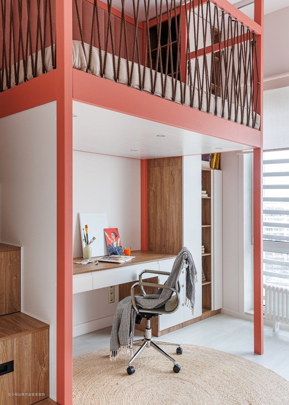 定制柜下面设计成书桌+书架组合,上面是床铺,可以用来休息。楼梯做成抽屉,还能用来储物。窗户下面设计单人沙发和边桌,放上地毯,改成休闲娱乐区,劳逸结合。