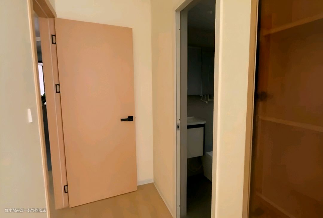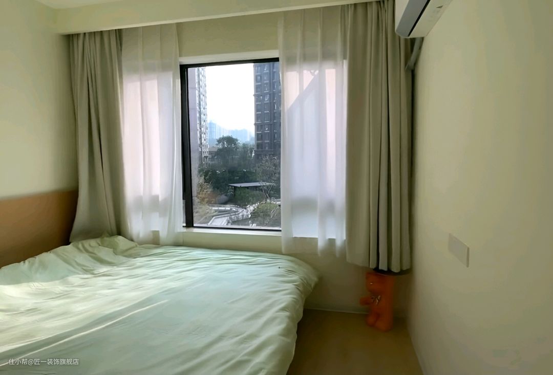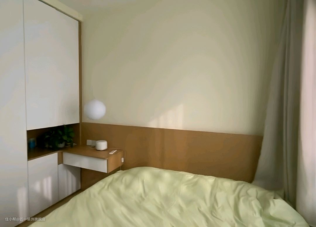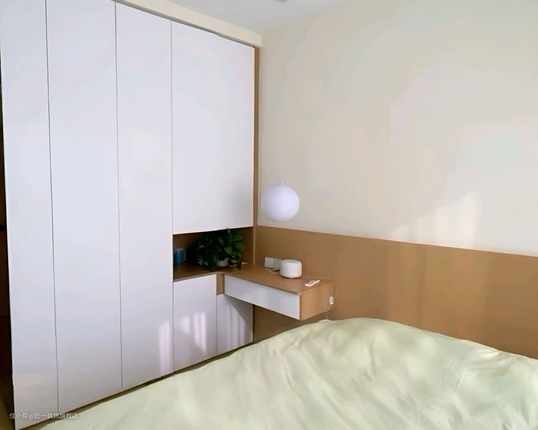 主卧室的墙面直接刷上白色乳胶漆,简洁明亮。不做吊顶,床头背景做半高的原木色木饰面,增加温暖感。衣柜设计为白色到顶,转角处采用悬空梳妆台一体柜门设计,无拉手,简约大方。