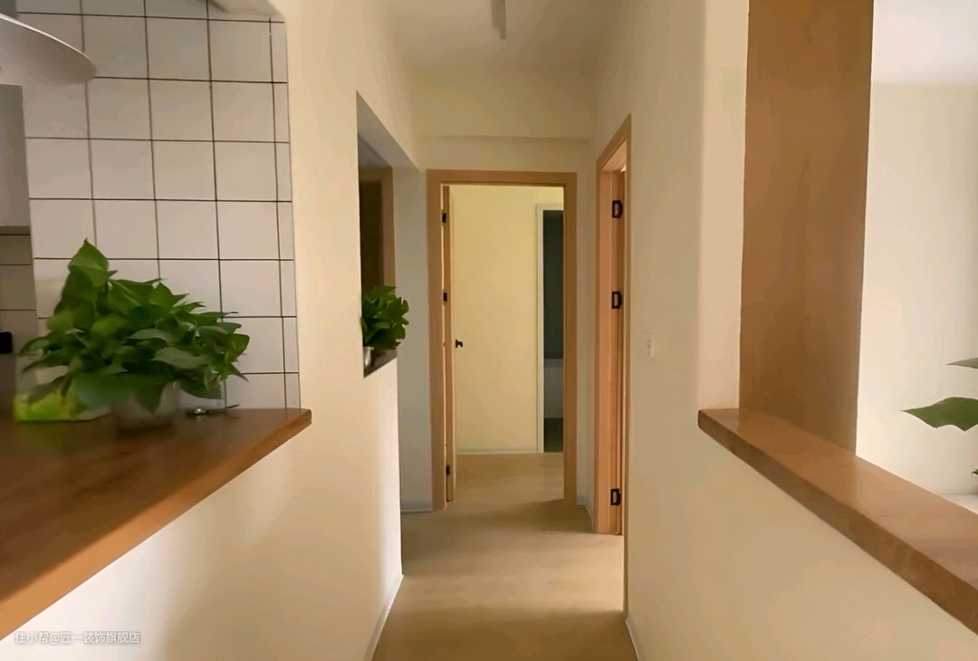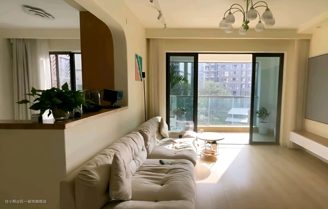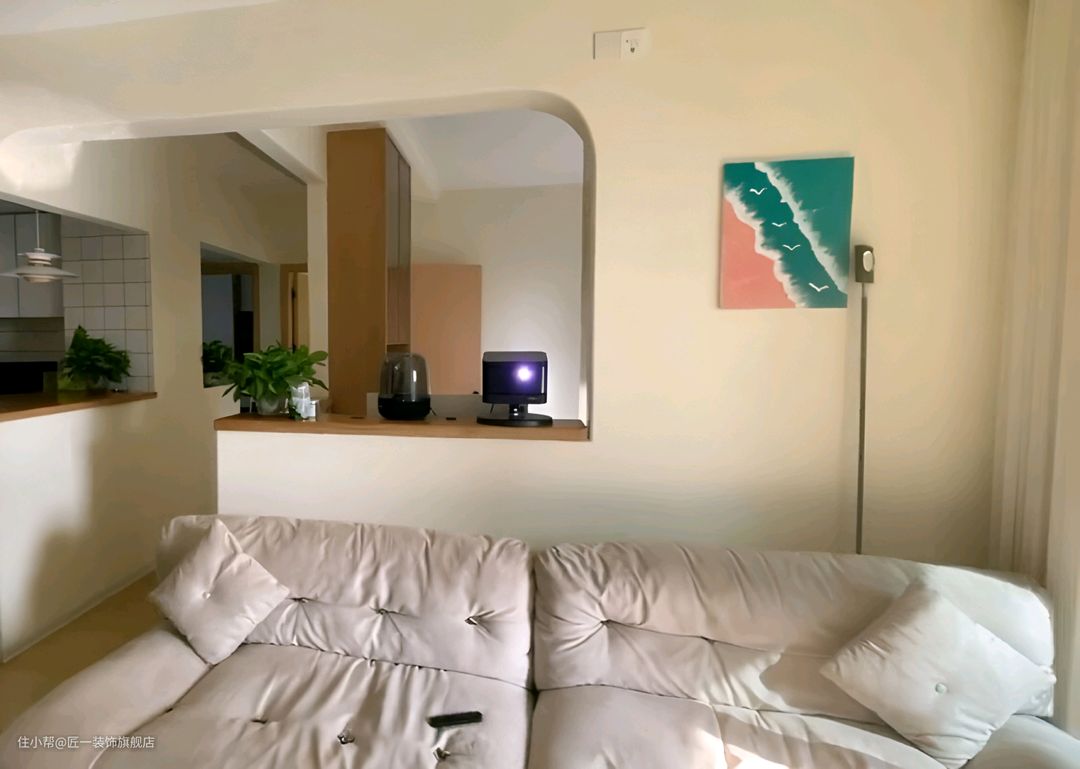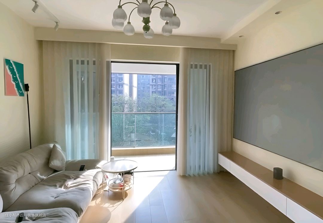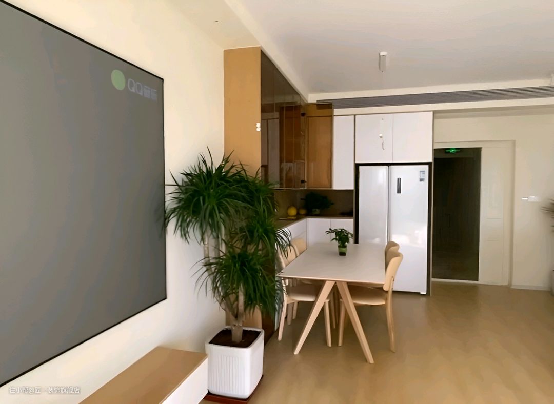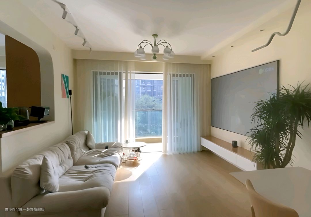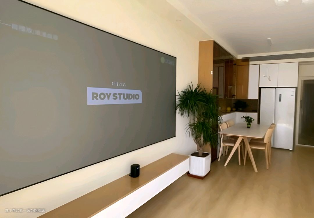 整体以白色和木色为主,通铺的原木色木纹砖为整个空间增添了一份自然与温馨。墙面直接刷上白色乳胶漆,简洁明亮。在客厅的电视背景安装投影幕布,搭配一个悬空的电视柜,让空间显得更为轻盈。家具选择灰色沙发,与投影幕布形成对比,增加了空间的层次感。