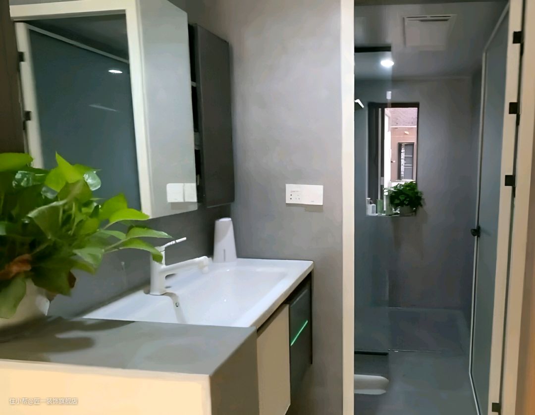 卫生间做干湿分离,半墙隔断,洗手台采用悬空设计,墙面和地面铺贴灰色瓷砖,简约而实用。
