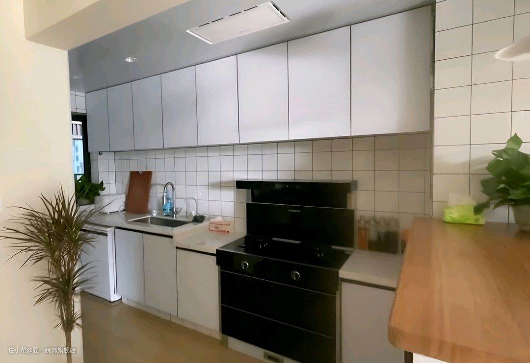 厨房也设计为开放式,使用小白砖作为墙面材料,搭配白色的橱柜和地柜,简洁而明亮方便清洁。