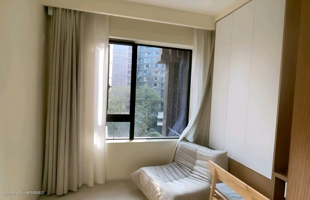 书房预留窗帘和灰色窗帘安装位置,放置白色的毛毛虫沙发。书房的设计充分考虑了实用性和美观性,半墙隔断使空间保持通透,同时又能保证私密性。